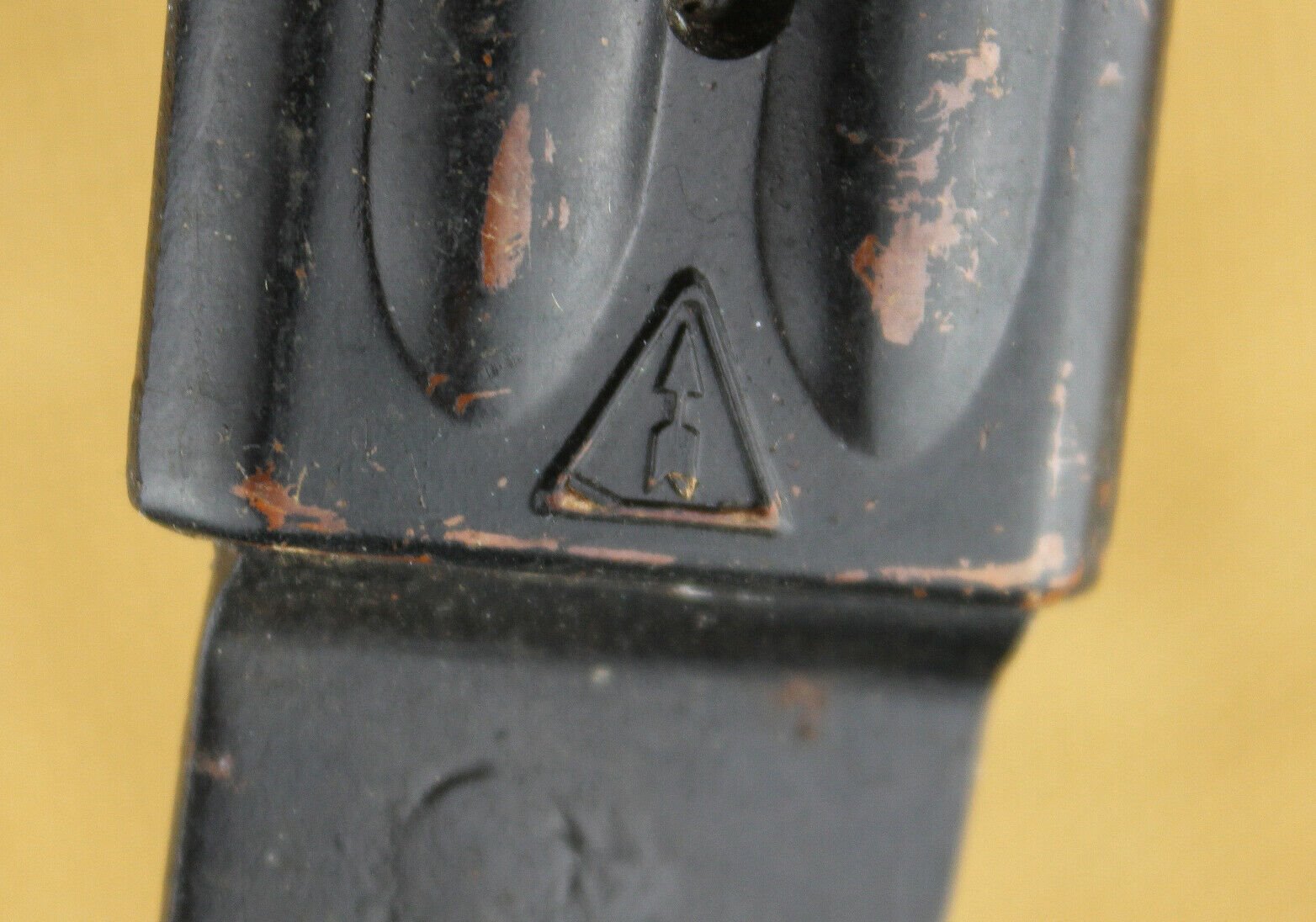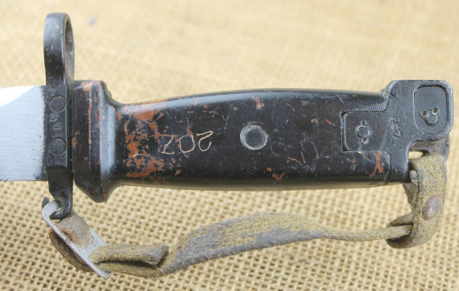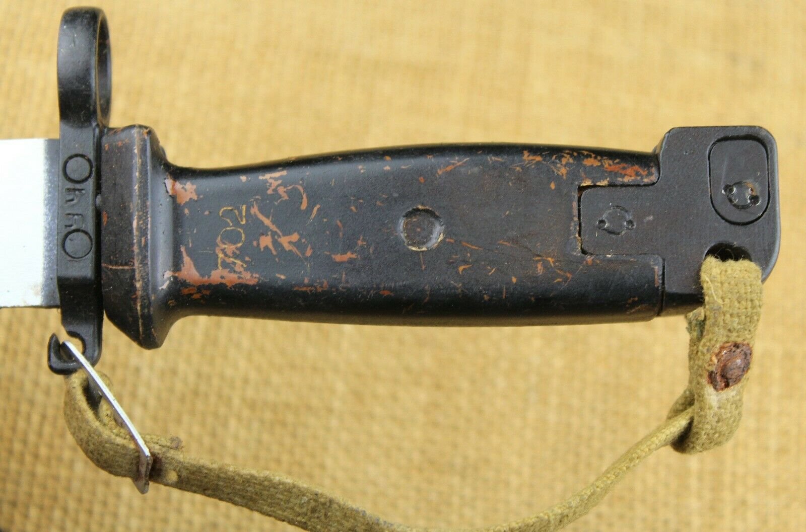 Both the bayonet and scabbard have been painted black. Two small Cyrillic letters have been stamped in the right side of bayonet cross guard and front of the scabbard cutter plate stop. These items should also have matching issue numbers as they are taken from issue inventory. Mike
