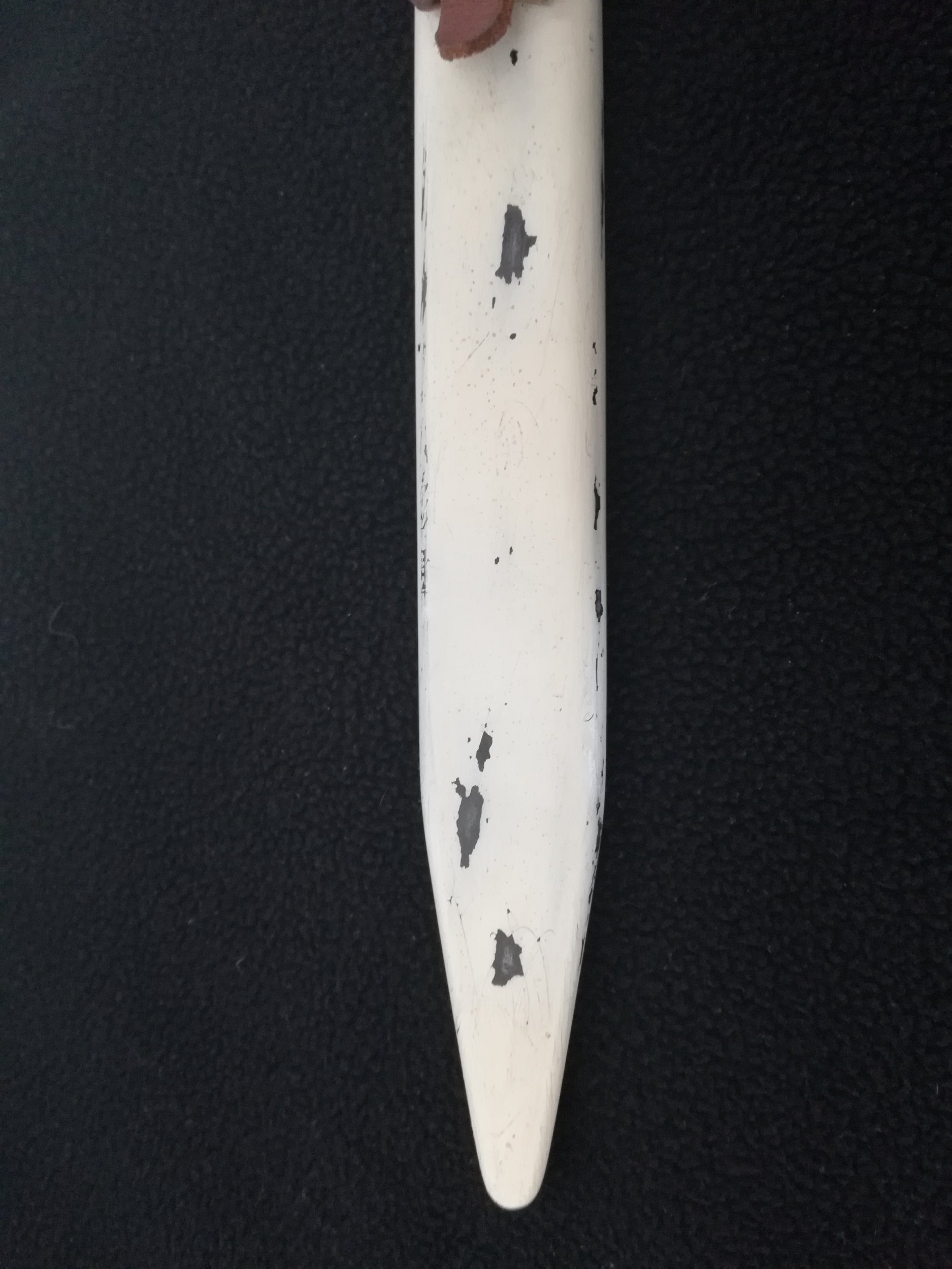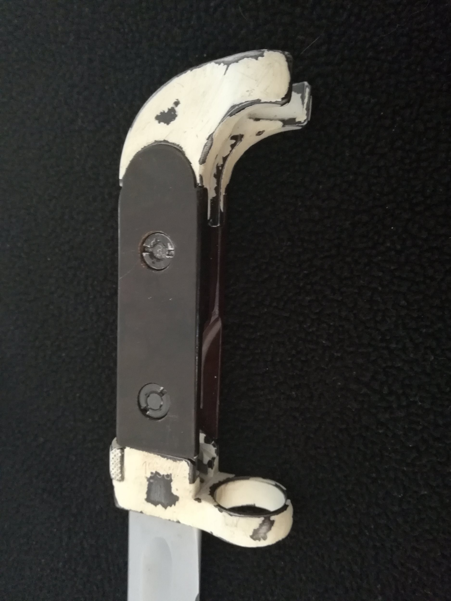 The description of the the bayonet and scabbard on the left side, (Foto 1.7) reads as follows: " During the rummage in the yearbooks of the weekly "Zolnierz Polski" I found in the bayonet AK-47 in the 1974 burial ground photographs of the border protection army, having a light gray color (photo 1.7)". In other reference books these white or light gray painted bayonets are a form of temporary winter camouflages during field maneuvers. These painted bayonets and/or scabbards can be found from several other countries. In the examples I have seen similar to yours the paint is more similar to white/wash, easily removeable, non-permanent coloration. It is usually crudely applied with no attention to detail. Unfortunately easy to fake. Mike