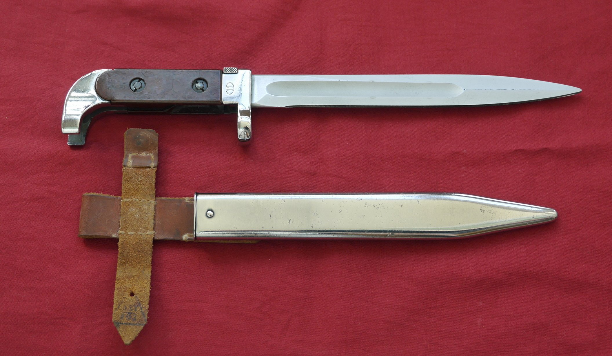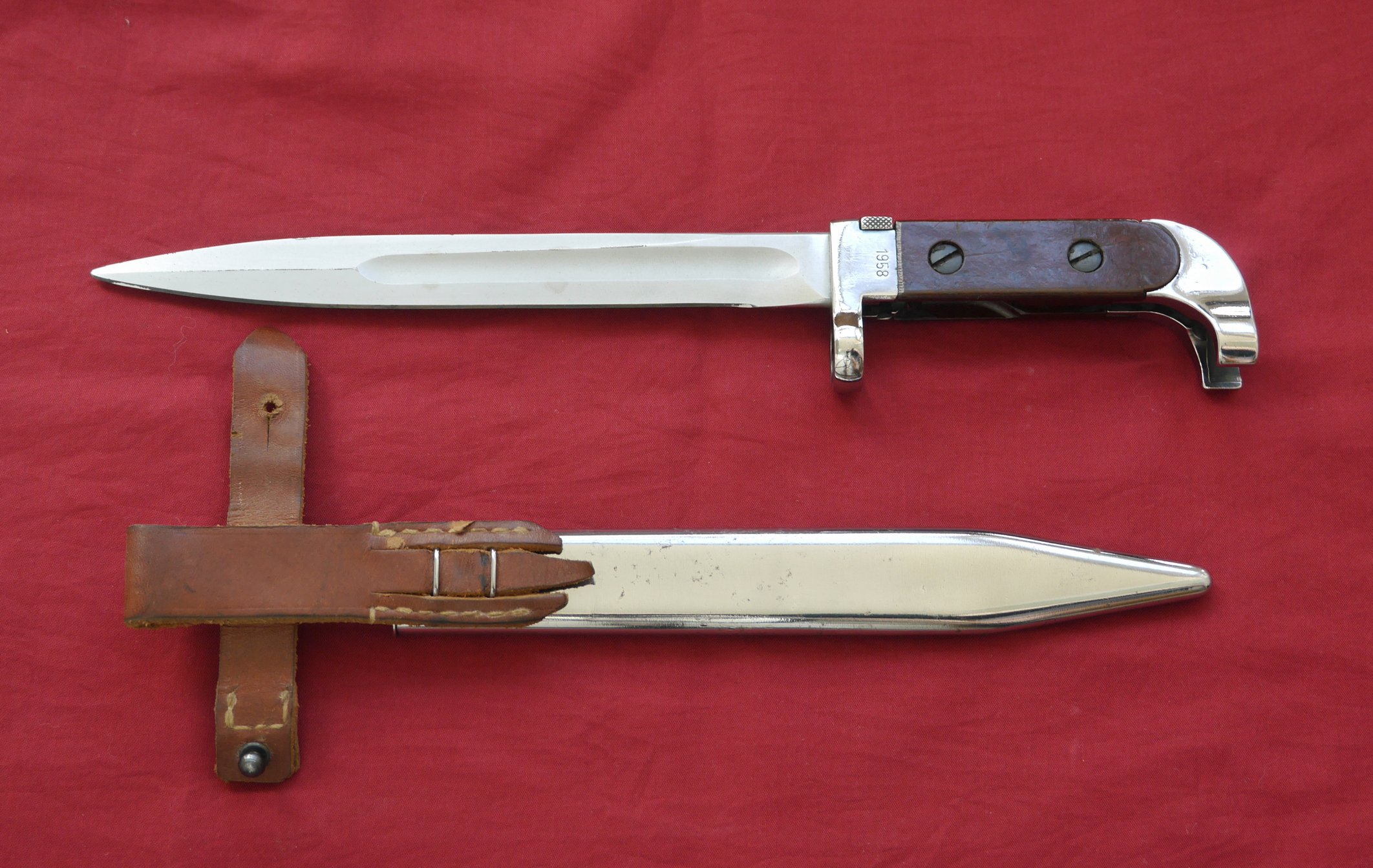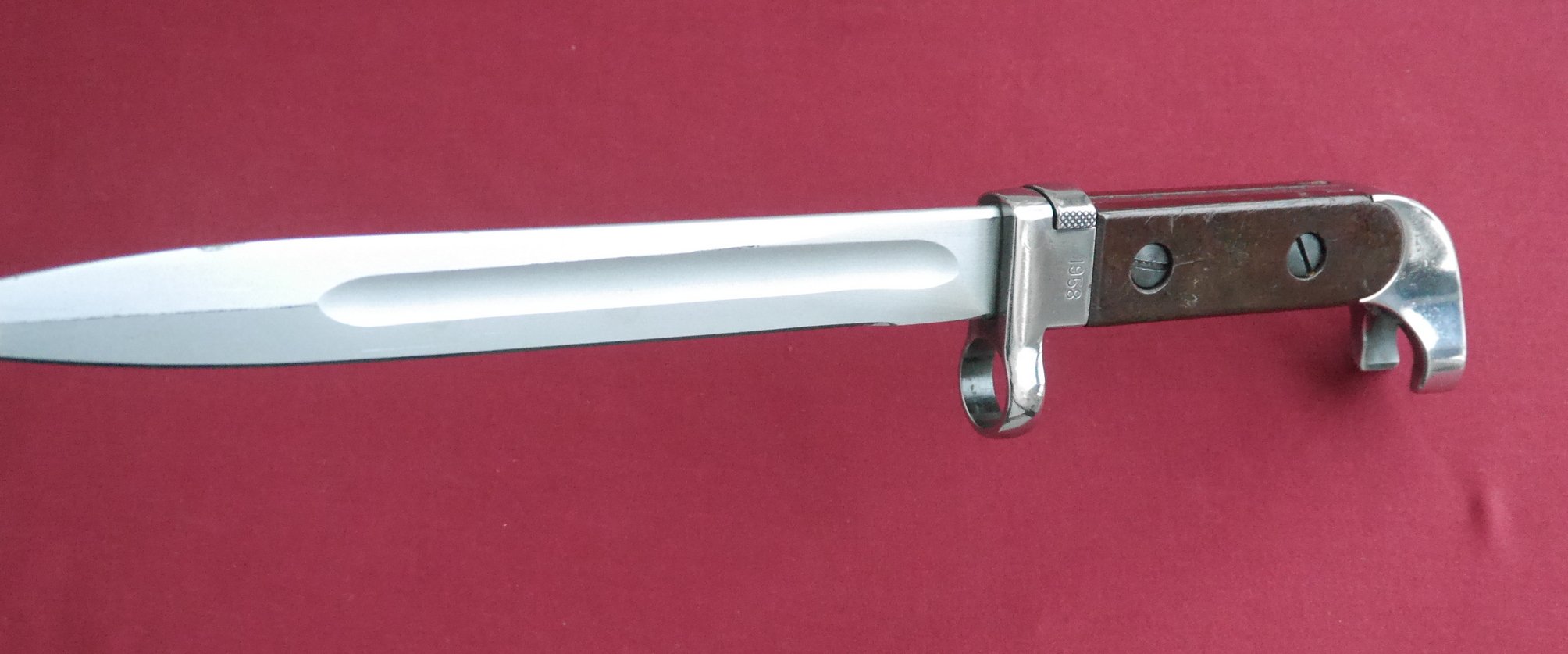Sorry, but this is not a parade/dress bayonet and scabbard. If you read the accompanying text on page 20, the parade/dress bayonet is on the right side of the page pictured above, (Foto 1.7a). It has the metal hilt and scabbard body chrome plated which does not show up well in the picture.