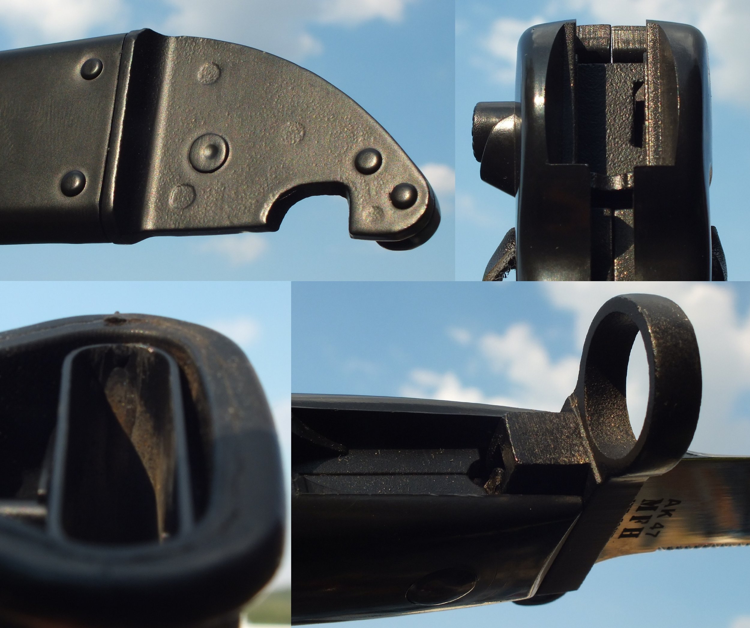 Very interesting commercial replica of an AKM 6X3 Type I bayonet and scabbard. I think MDI was asking about a black Hungarian version some time ago. There are lots of interesting little details in that picture. It would be interesting to see more detailed picture and information. I wonder if it is all new materials or if some of the pieces are original from some country. For example the grips and scabbard from East Germany? The leather pieces could be originals dyed totally black, not just black faced leather. However the hanger stud has a screw back that is commercial. The angulation of the blade saw teeth seems to change, weird. Also the flat behind the muzzle ring seems too long. Blade marking is AK 47 is incorrect as it is an AKM. Nice display piece though, I would like to have one.
