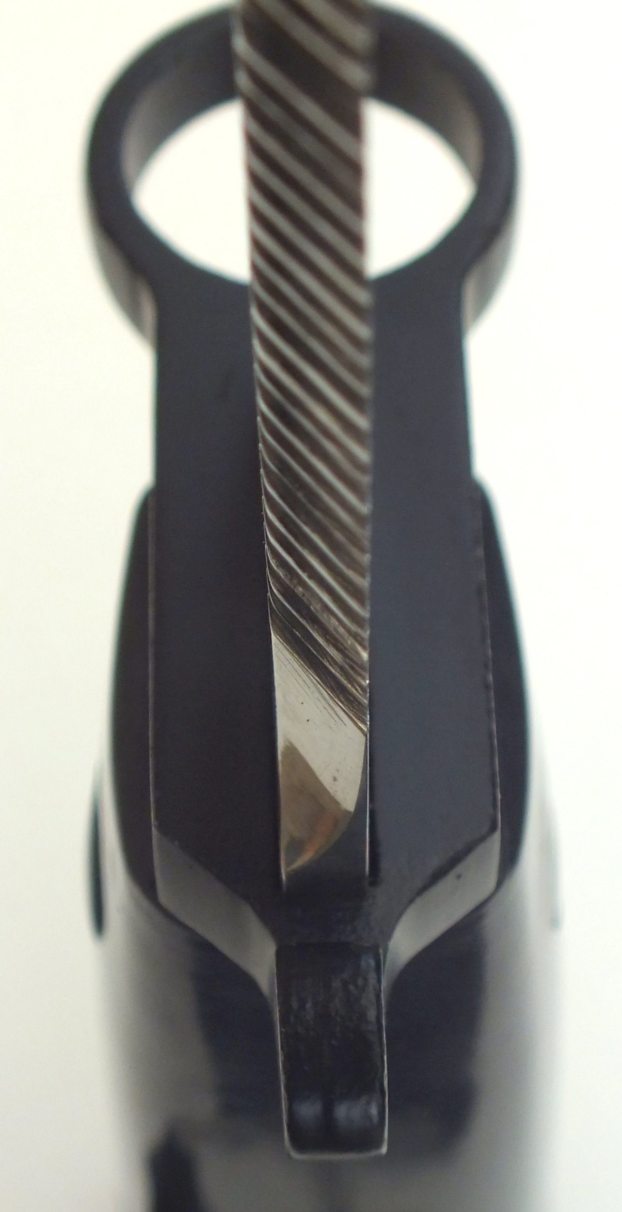 Die Scheide ist aus zwei Blechteilen verschweißt und verjüngt sich um 2,0 mm von oben zum Scherteil. Das Scherteil ist ohne Reinigungsloch. Die Hakenöse steht sehr weit nach außen.