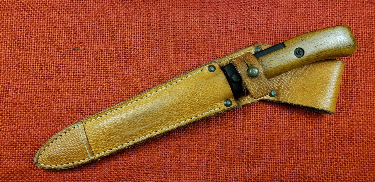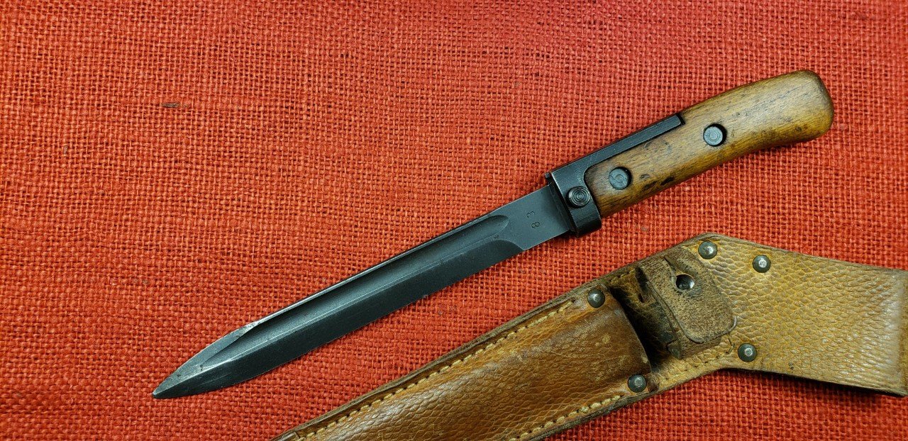I finally found one on eBay. Received it today. Czechoslovakian VZ58 Type I bayonet and scabbard. This one has the official authorized hilt modification. This was done by removing the original grip panels and welding on a pre-formed tang extension. This was ground smooth and then refinished. New Type III grip panels were then installed and riveted in place using authorized rivets and placement. This one is in decent shape considering it was reworked to start with. This completes my collection / display of VZ58 bayonets and scabbards either standard production or with authorized modifications.