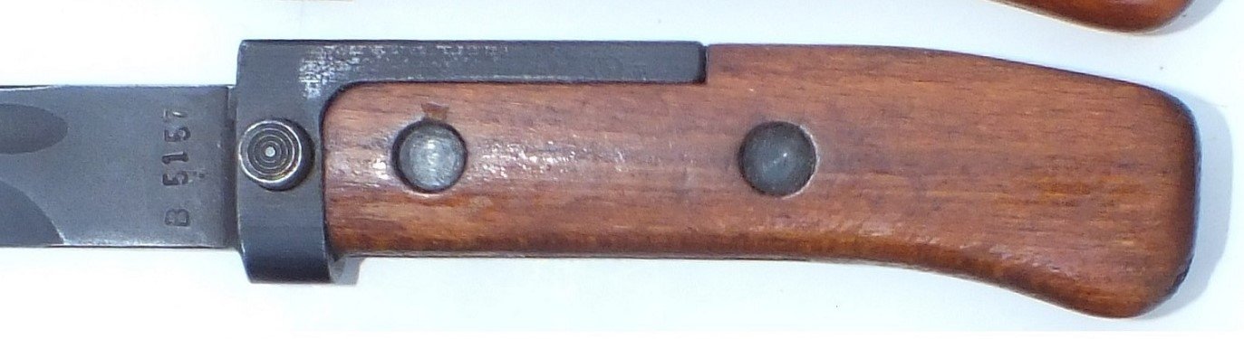 Note that any Type I bayonet without rivets or rivets in different locations is not original. The original and replacement wood grips were supplied pre-inletted and finished. The grip is held in position by the rivets and using the small holes in the metal hilt tang and grip. Also note that they only used a certain style of rivet and setting for ALL 3 Types of the VZ58 bayonets. All other rivets or fasteners are either from emergency repairs or unauthorized. Fakes and replicas are quite common. Mike