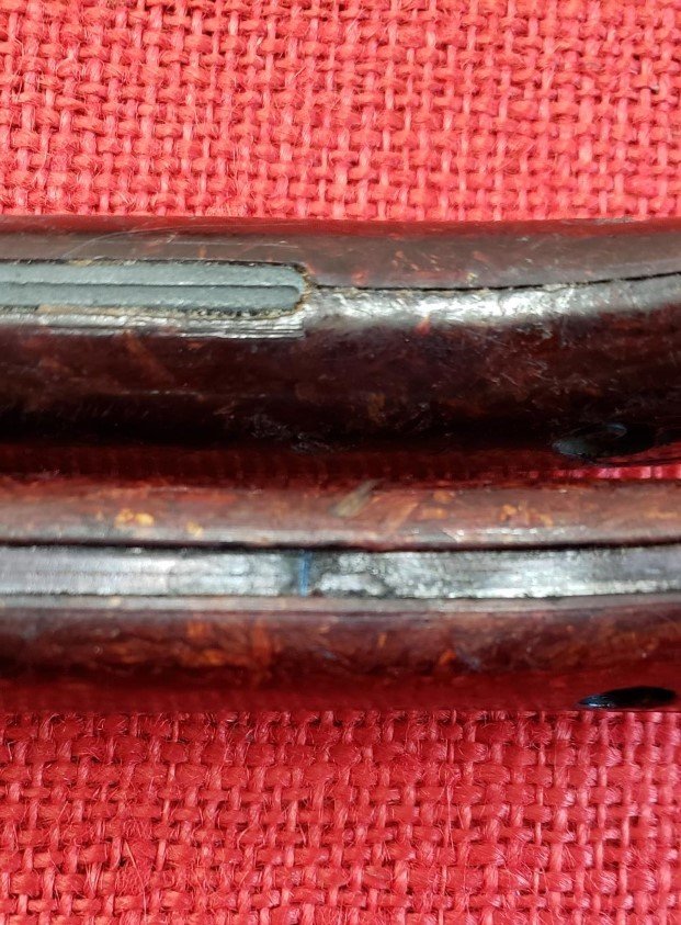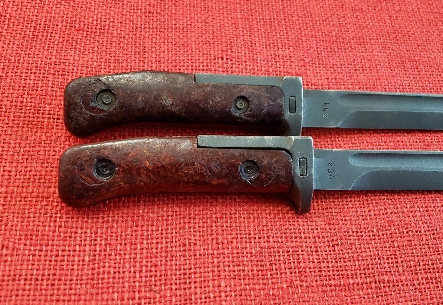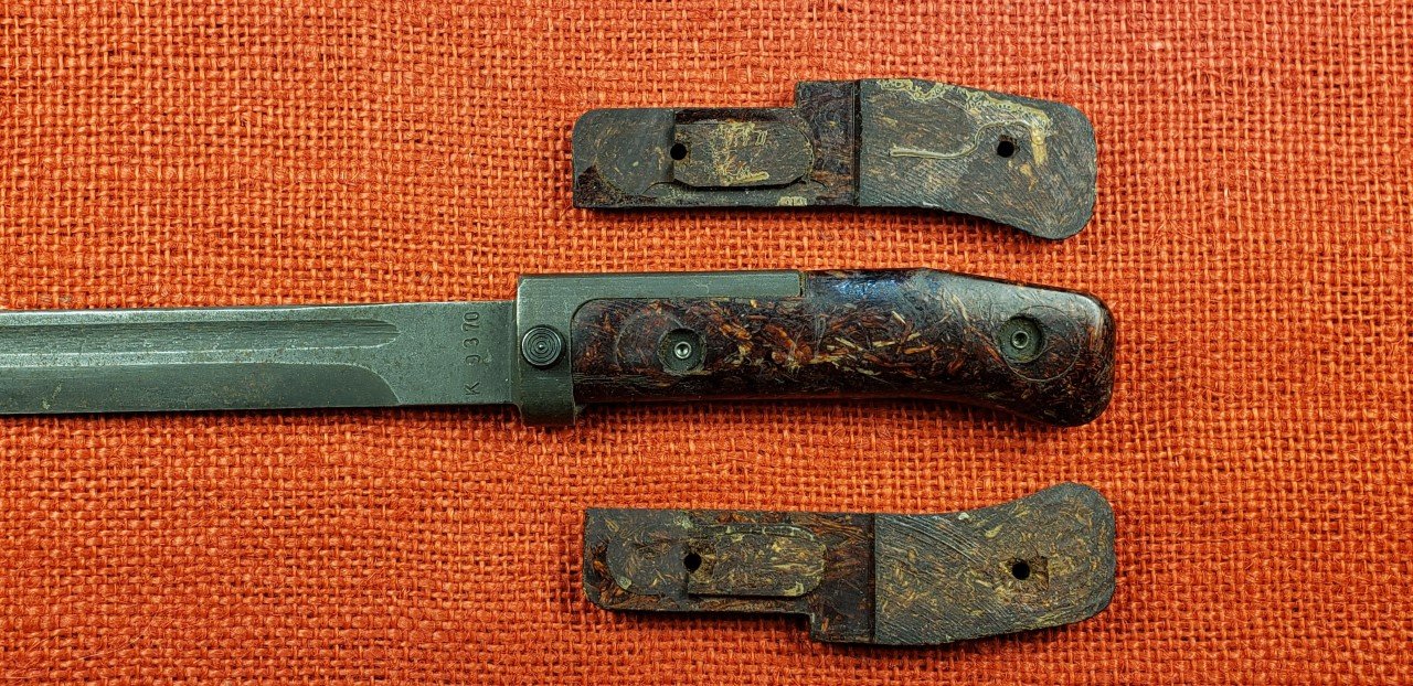 These modified bayonets are rare and difficult to identify. Without removing the grips, all that can be seen are evidence of welding and grinding on the top and bottom of the hilt tang where the weld was made. Pictures are borrowed as I do not have an example. Mike
