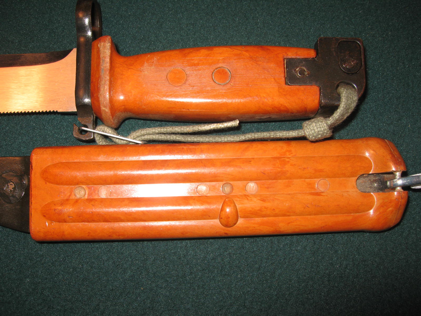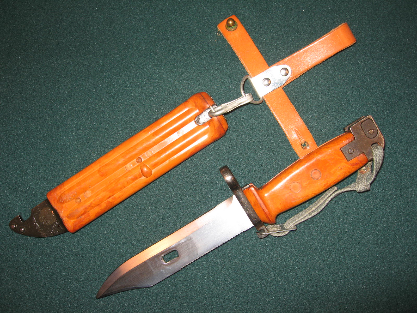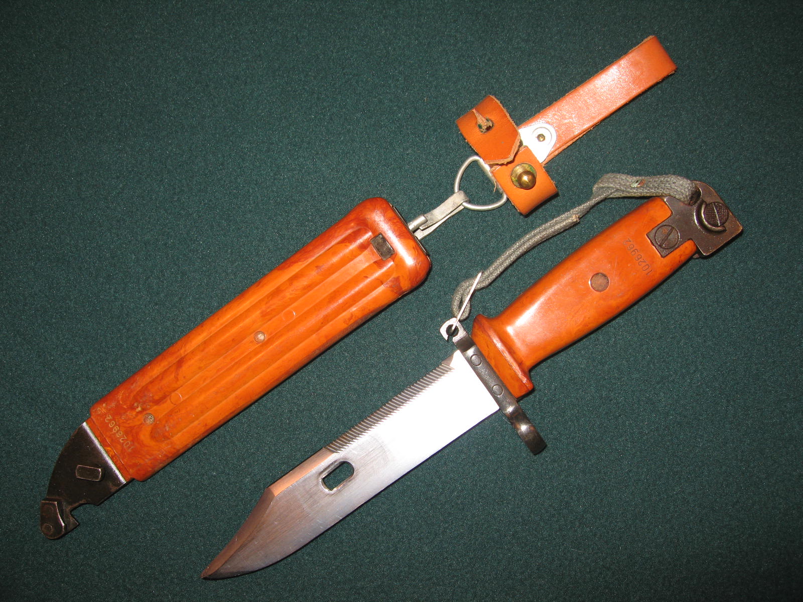 As with Richard's hanger, all of the hangers that I have seen from bayonets captured in the Tabuk factory have hangers that fasten right over left as viewed from the front versus left over right for Yugoslav hangers. There is alos differences in Tbauk made wrist straps vs. Yugoslav made wrist straps.