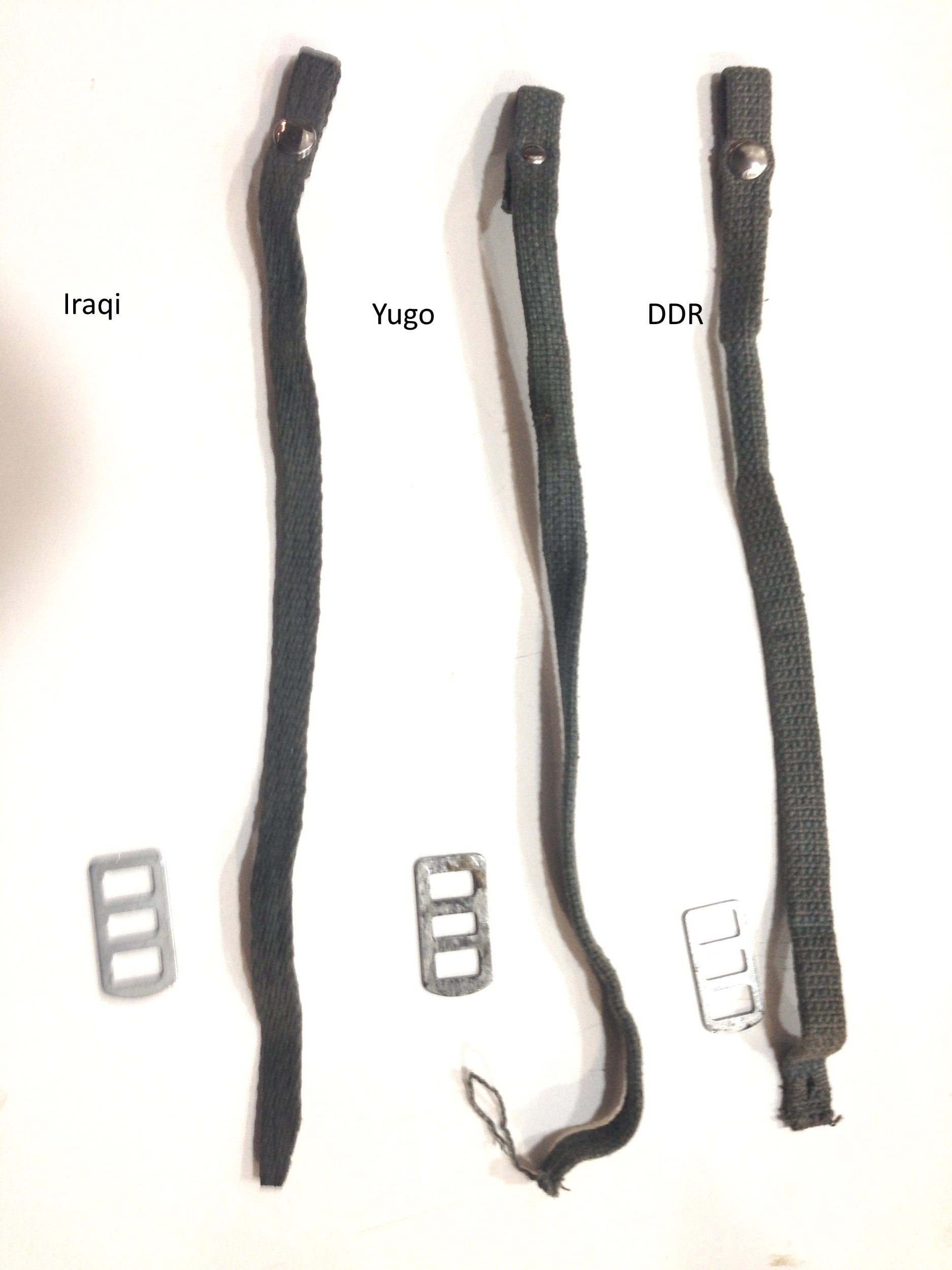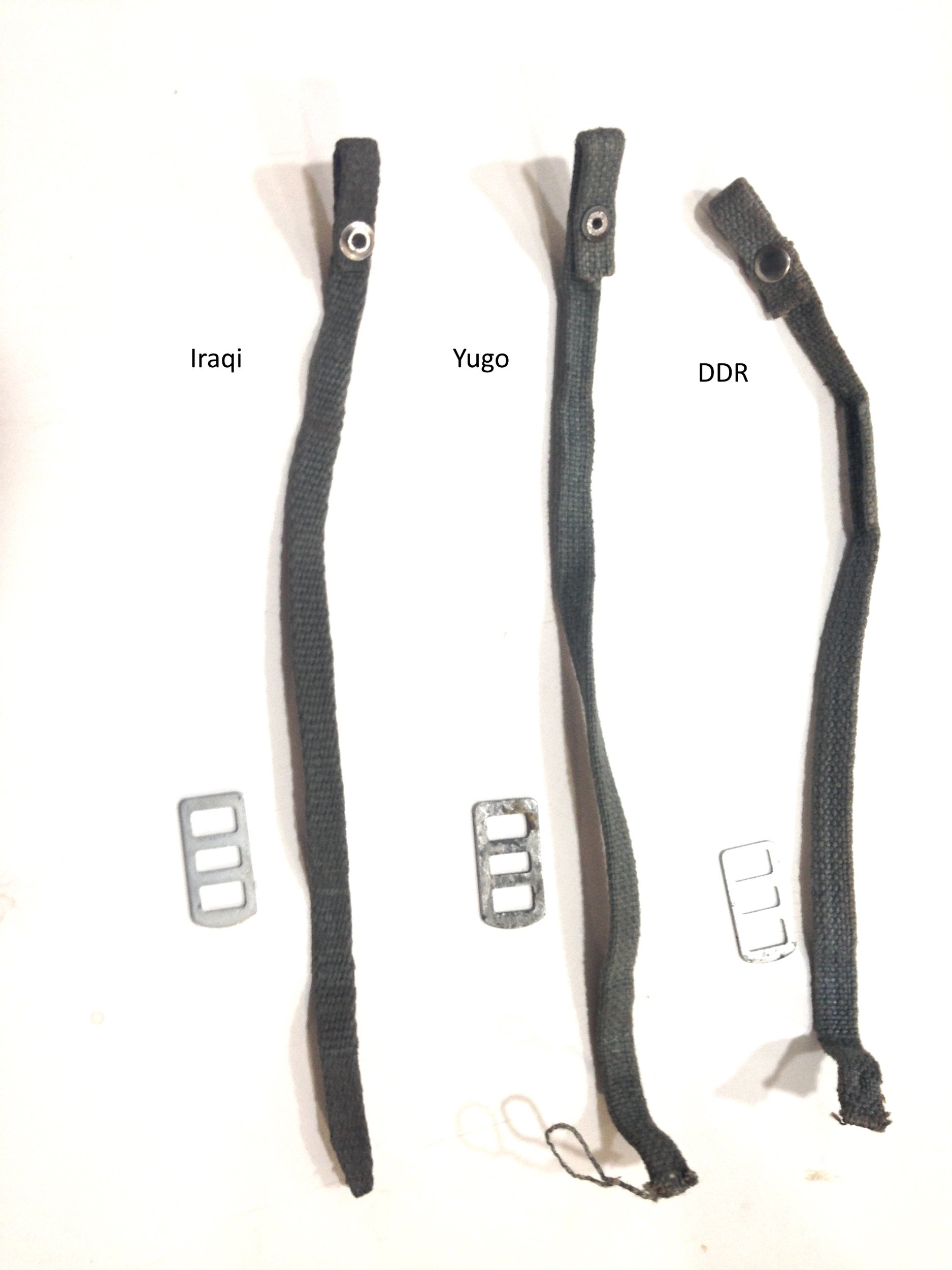 Martin, I agree with the pictures of the wrist straps you posted. The one identified as Iraqi may well be as it is different from any of the Yugo ones I am familiar with. Definitely not DDR. I have had many of them both used and new in sealed DDR inventory packages with labels. Very consistent with only slight fabric color variations and with double headed rivets. There are a lot of differences in the Yugo wrist straps. Again I have had access to large quantities of both new and used ones. I have posted pictures of them under "Yugoslavia" - Yugoslavian AKM Belt Hangers & Wrist Straps. Mike