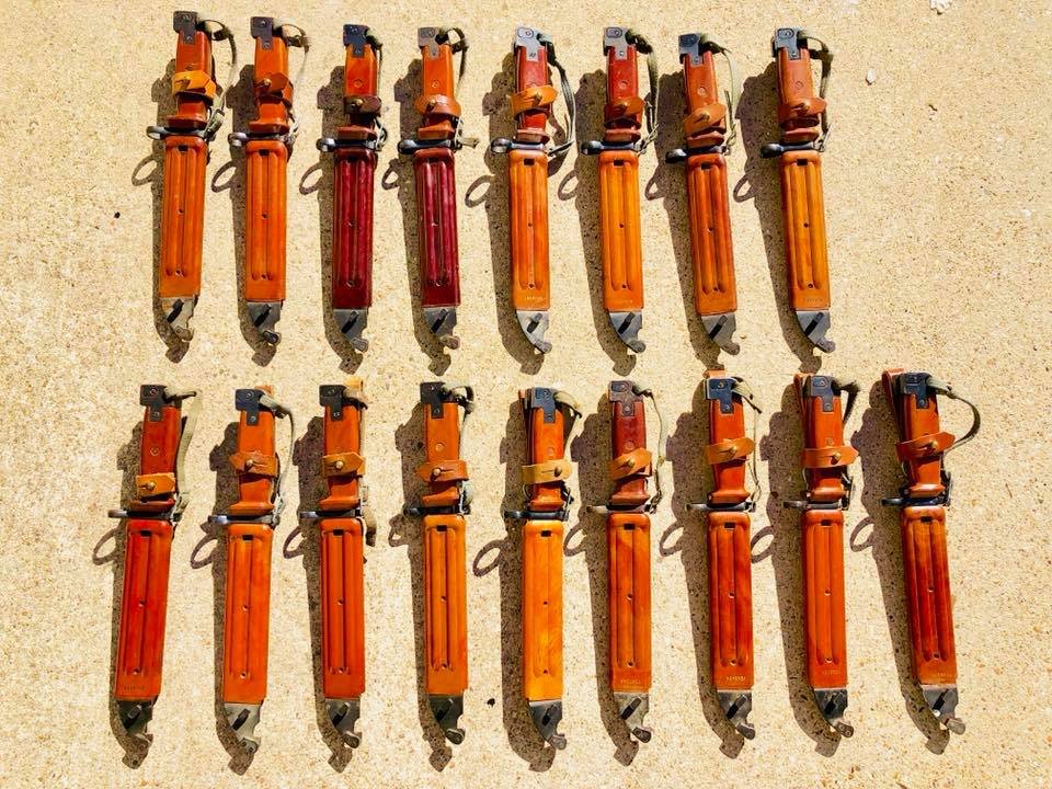 Here is a picture of a group of17 Tabuk bayonets and scabbard from another site. I am posting this to show the different variations in color and other small details. Also note the variations in the hangers as mentioned by Martin. They cross both directions. Interesting! Tabuk or not Tabuk? Mike