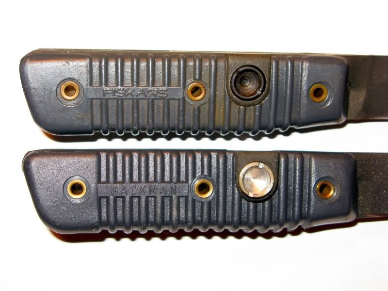 Here are close-up views of the Valmet M62 showing the three different manufactures. Fiskars, Hackman and Unknown. Notice the difference in the grip rib molding and the release catch button. Also note the different metal finishes. Blued, parkerized and black crinkle paint. Even the rivets are different. The unmarked version may not be a third company but made by Fiskars and/or Hackman as a "sterile" contract for internal use or export. Mike