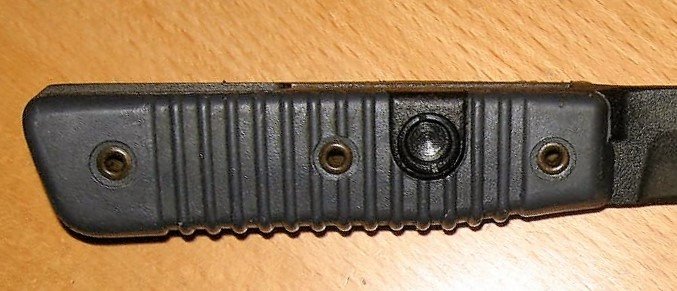 This is my Valmet. It is unmarked and has the short clip point. I do not have a Fiskars or Hackman version. I keep this one as a representative sample in a side collection as it is not a true Kalashnikov bayonet. Note the unusual means of attachment, the long bayonet mounting lug is part of the flash hider. It mounts from the front, unlike the similar Czech VZ58 which slides on from the rear. M.