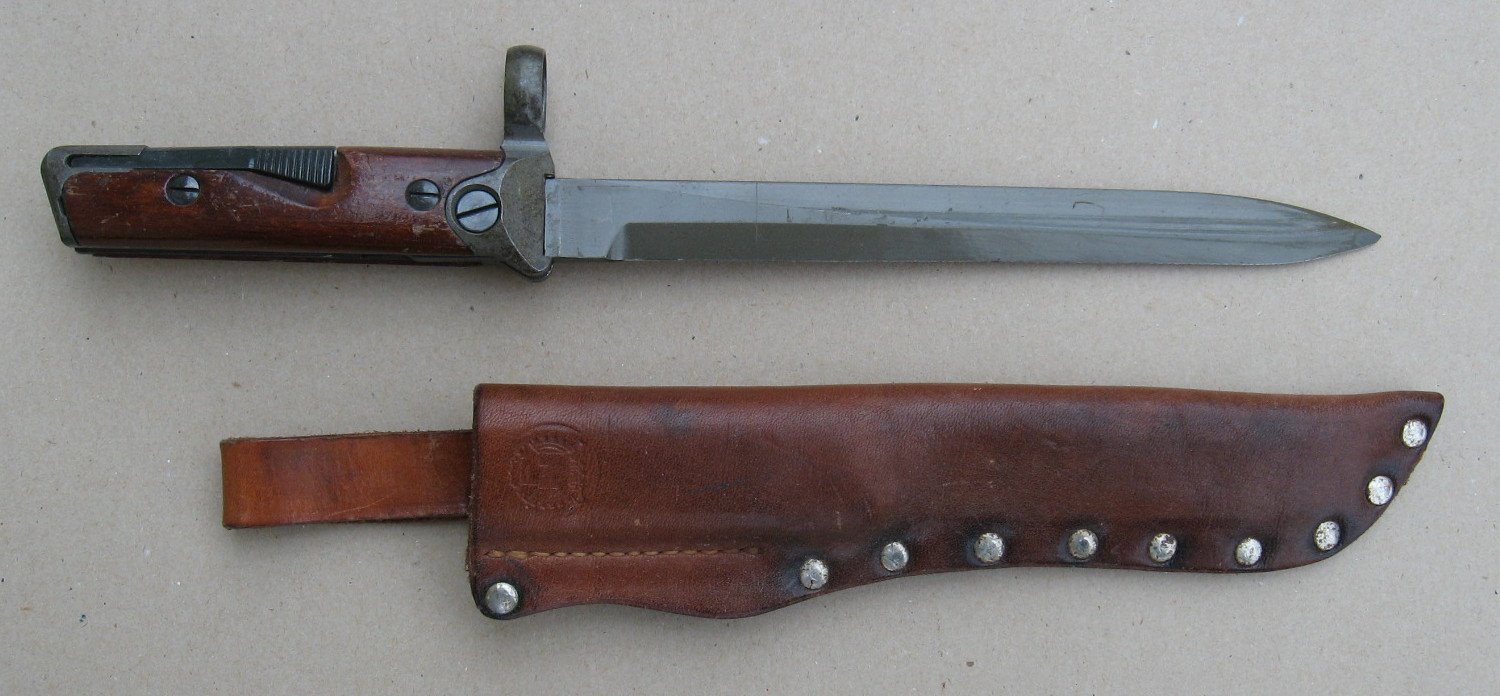 The original Finnish version of the Kalashnikov AK47 was the M60-1. The bayonet made for it was a Finnish modification of the Italian M38 folding blade bayonet with the latch lock mounting catch. Finland had imported these rifles and bayonets during earlier wars. The early M60 had muzzle rings the later ones did not. Finland made up their own folded leather scabbards that held the bayonet when folded. Here are pictures of two early versions and one later one. Mike