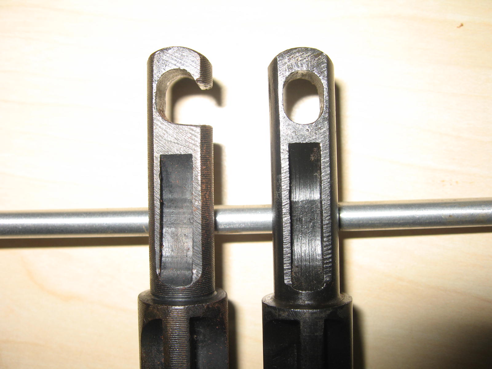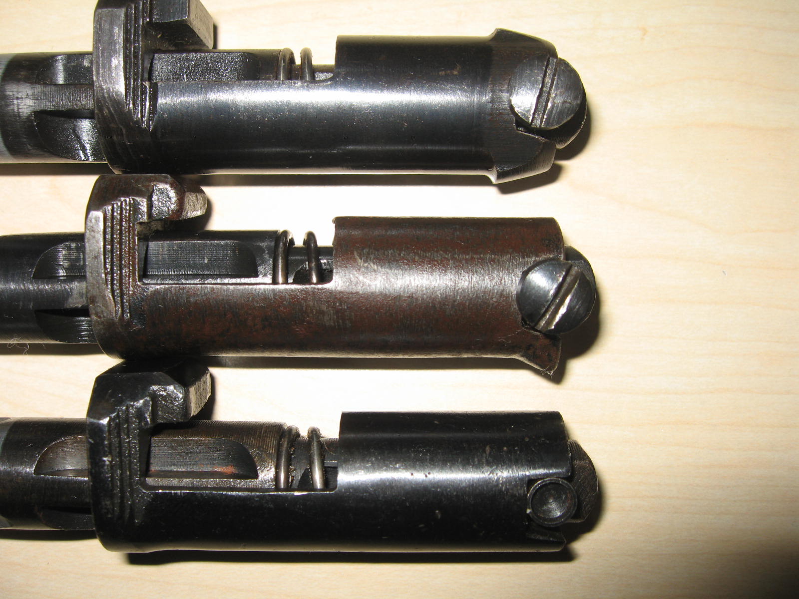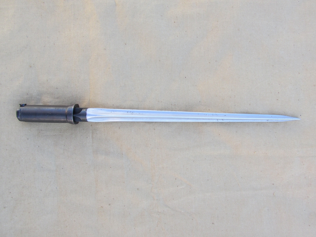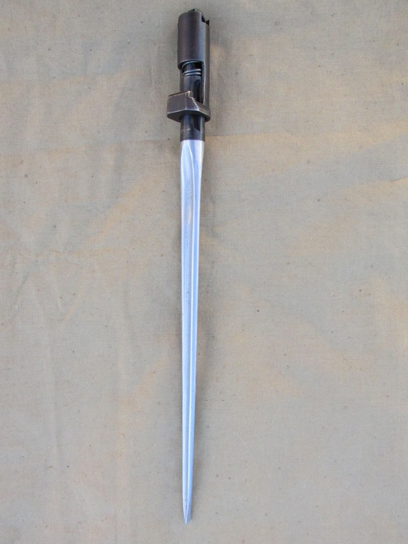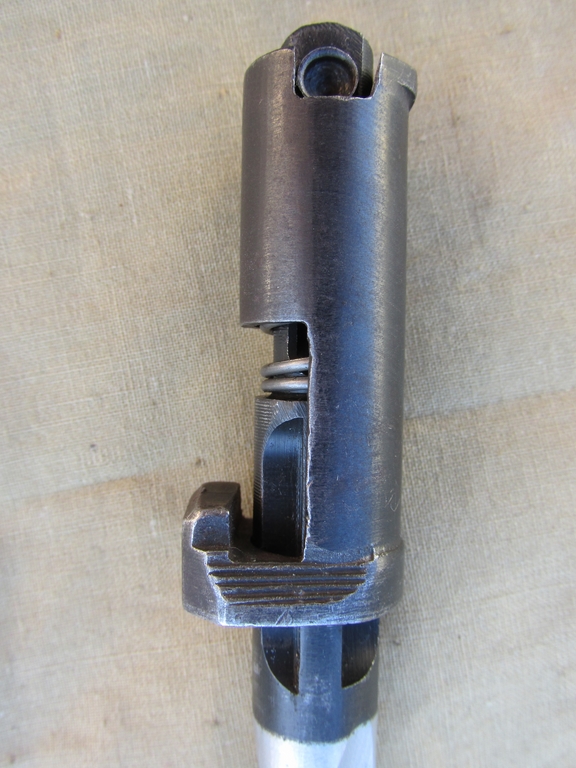 All the bayonets that attach to the front sight base are basically the same. The next main difference is the bayonet point. They are all screw driver points, but some are aligned horizontal and others vertical. Another difference is in the method of attachment. Some use a countersunk and threaded machine screw and are removable, others use a double headed rivet and are permanently attached, (rivets are also found of different diameter). Note, some of the latter style have been altered to be removable to meet our import requirements. More on these and machining and finish variations to follow. M.