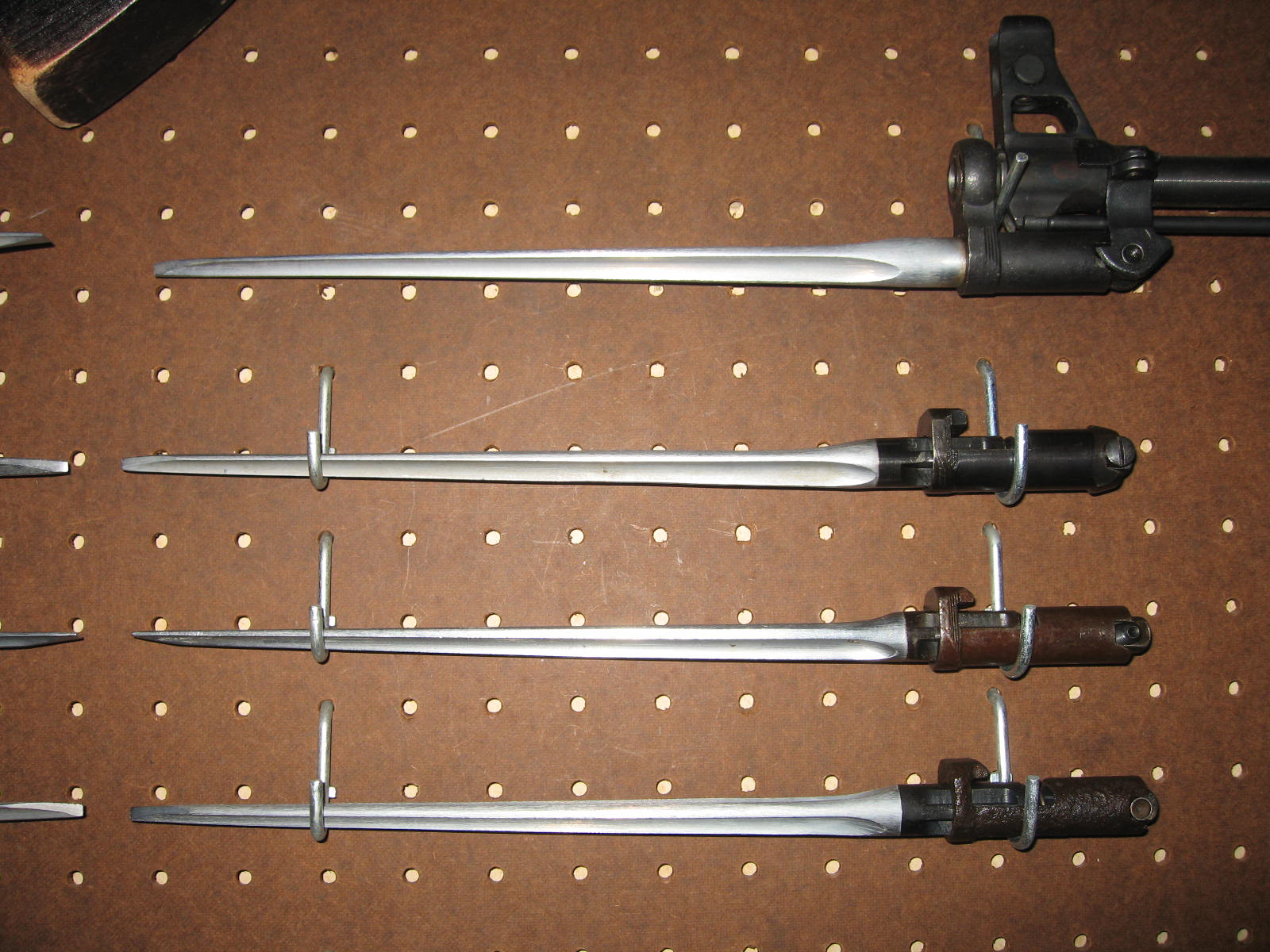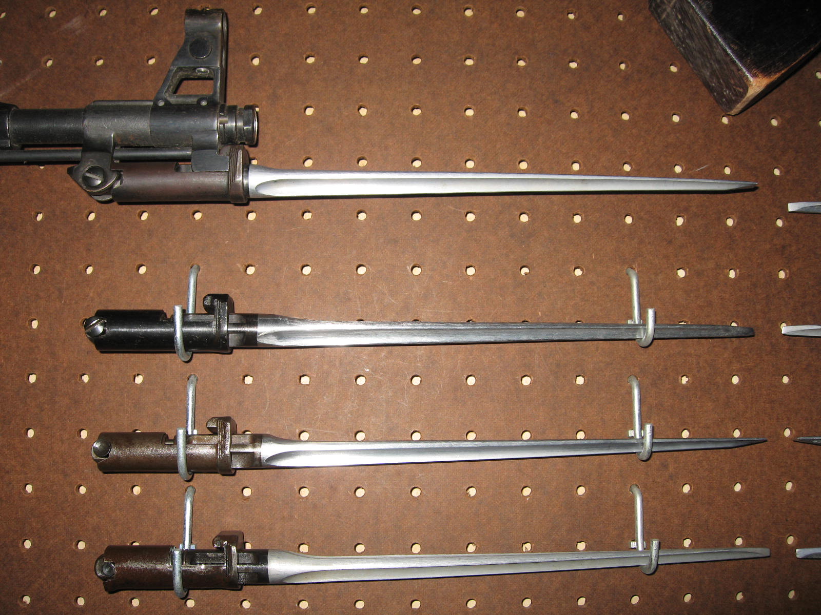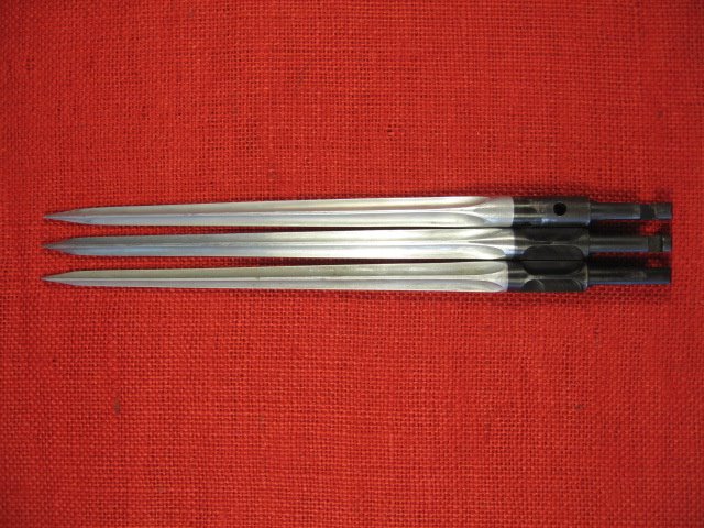Here are some comparison pictures of 3 versions of the Chinese Type 56 bayonet blades. The top one is a commercial pinned version. The middle one is a standard military type. The bottom one is from a add-on/clamp on version. The clamp on blade is usually permanently riveted to the mounting assemble and the sliding hilt has a muzzle ring. Mike