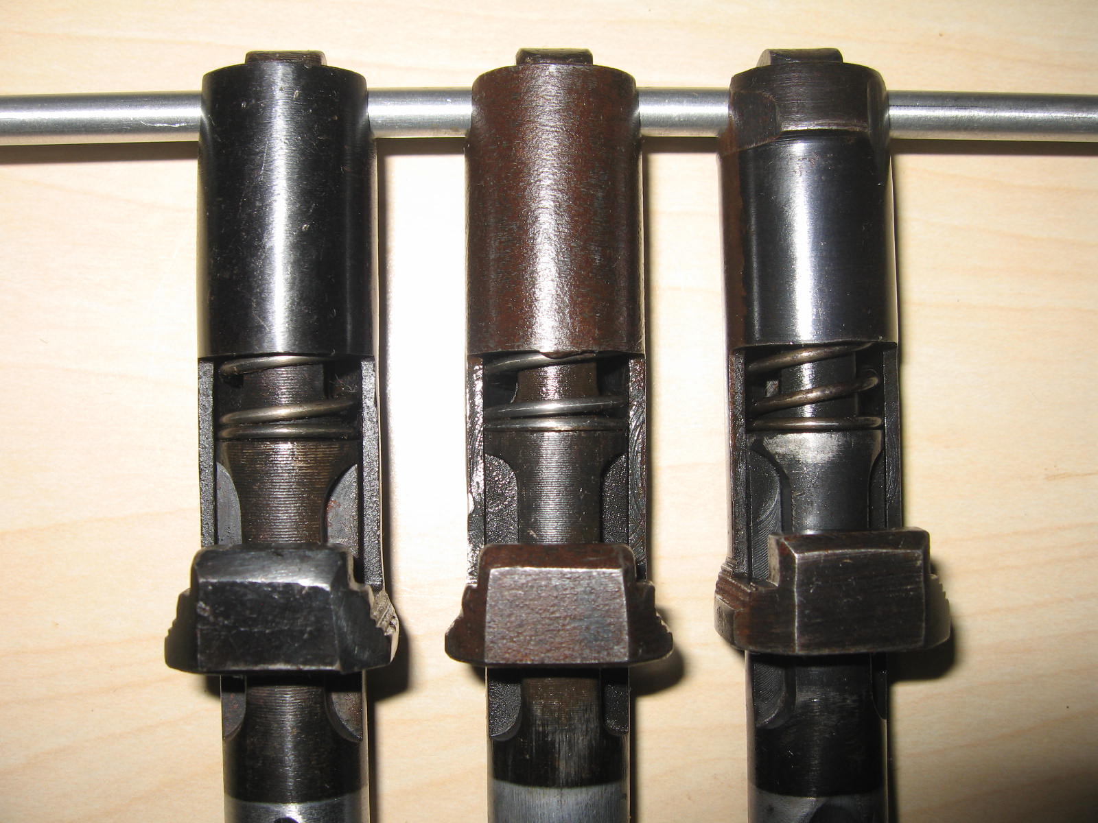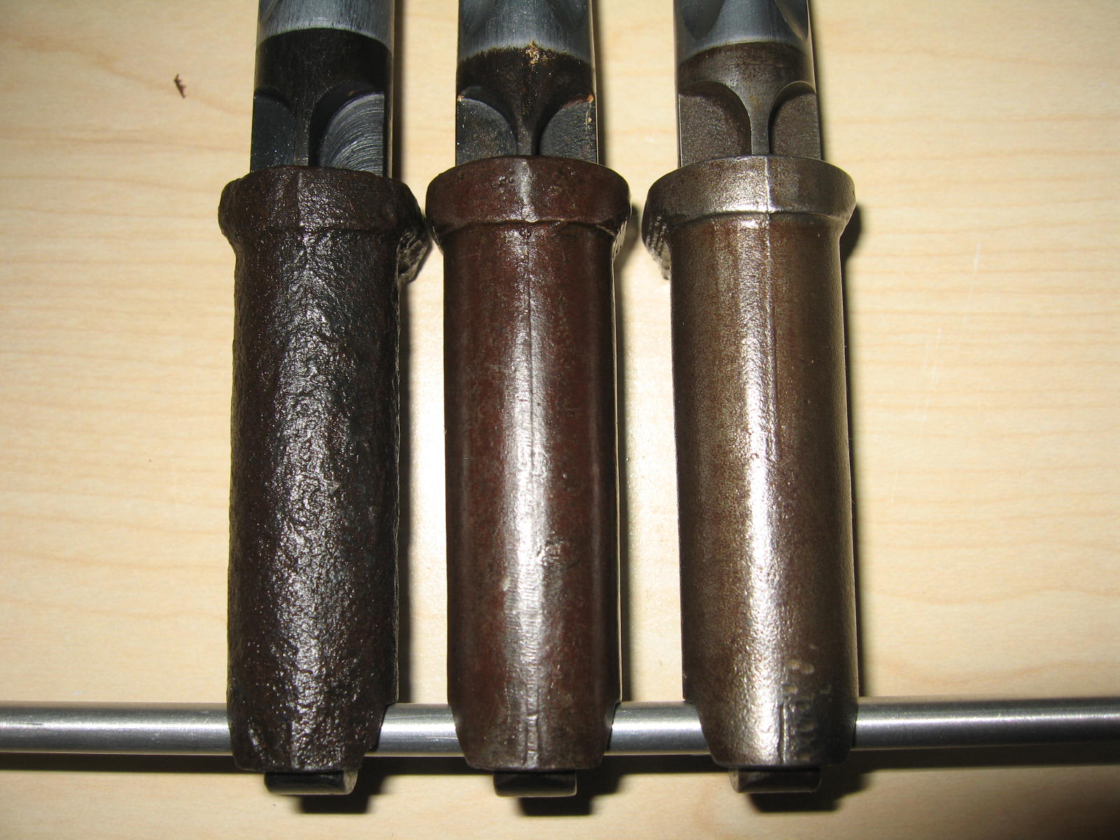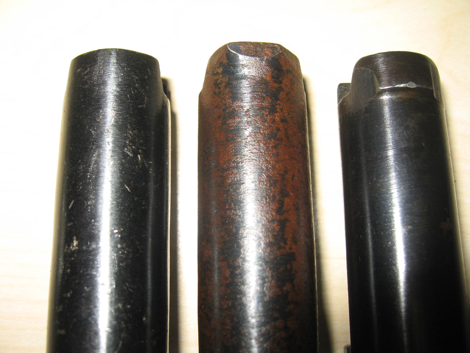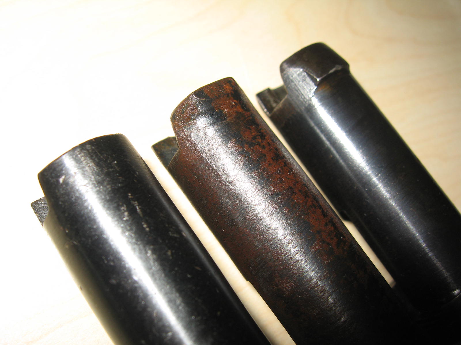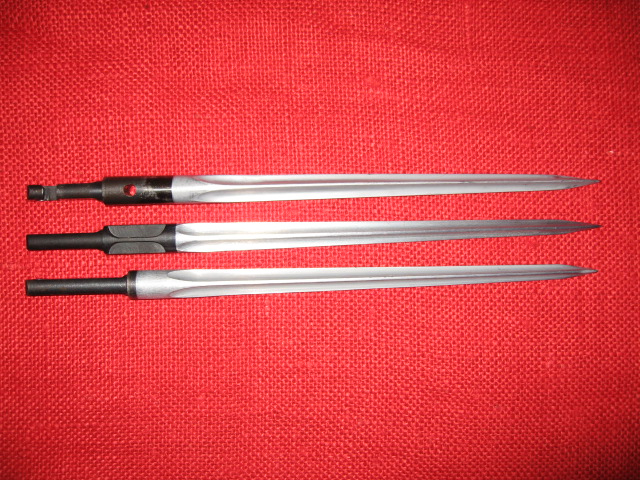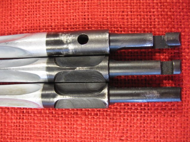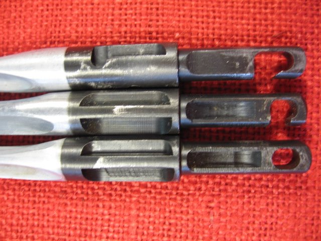 Here are three fully machined and finished Type 56 spike bayonets. Two are nicely blued and the other has a rusty brown colored finish. One has a straight sided hilt at the back. A second one has a single anti-rattle protrusion on the lower rear of the hilt. The last one has two anti-rattle protrusions at the back end of the hilt. One on the top side and one on the bottom. These bumps or ridges put pressure on the rifle's cleaning rod to keep it from being loose. The single bump only works when the bayonet is retracted. The double bump works both extended and retracted. M.