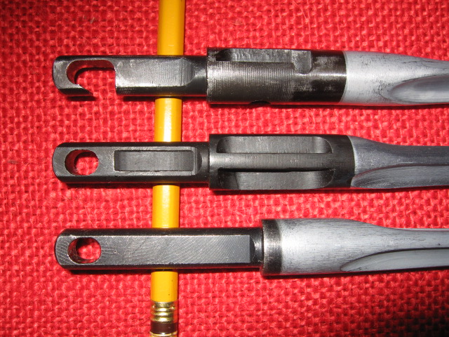 This is the last post in this series. These pictures show the different point styles, horizontal vs vertical. The different mounting holes, the "J" hole is for the easy disconnect versions. The last picture shows some of the different finger groove styles, different ones have 3 to 5 machined grooves. There is at least one version of this bayonet that I am missing and would like acquire. It's a detachable, "J" hook style but with a pin or set screw in a slot on the hilt keeping the assemble together when removed from the rifle. If anyone has information on the availability of one, I would appreciate hearing from you. M.
