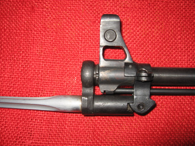 I acquired a different version of the Chinese Type 56 folding spike bayonet today. It is a commercial version designed to conform with USA import requirements. The bayonet is made to be easily detachable from the rifles and hooks to a rivet/pivot on a bracket attached to the front sight base. This version is what I refer to as the pinned version as a large pin holds the sliding hilt and spring to the blade shaft when the bayonet is removed from the rifle. This pinned version is one of three basic versions of the commercial removable bayonets. Mike