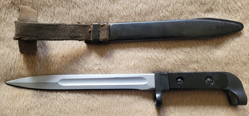 Hi Stefan, My best guess is East German, (DDR), AK47 6X2 bayonet. The scabbard is definitely E.G. AK47 first variation that has been reworked and belt hanger replaced.