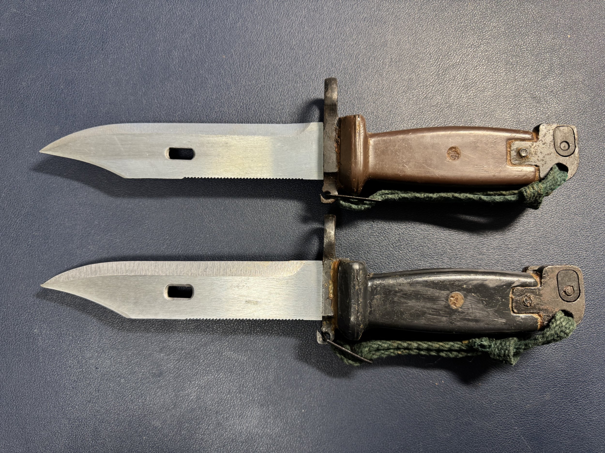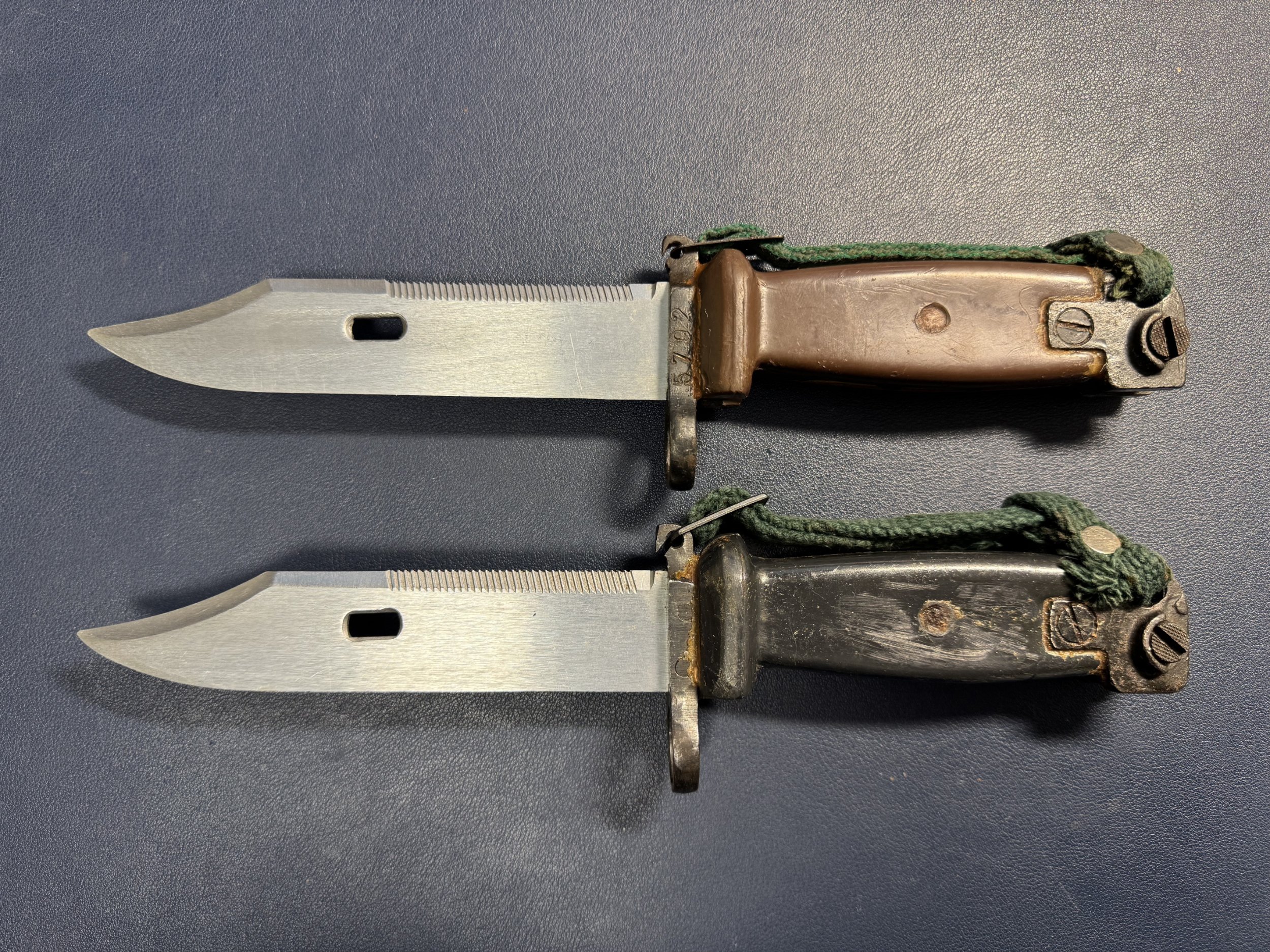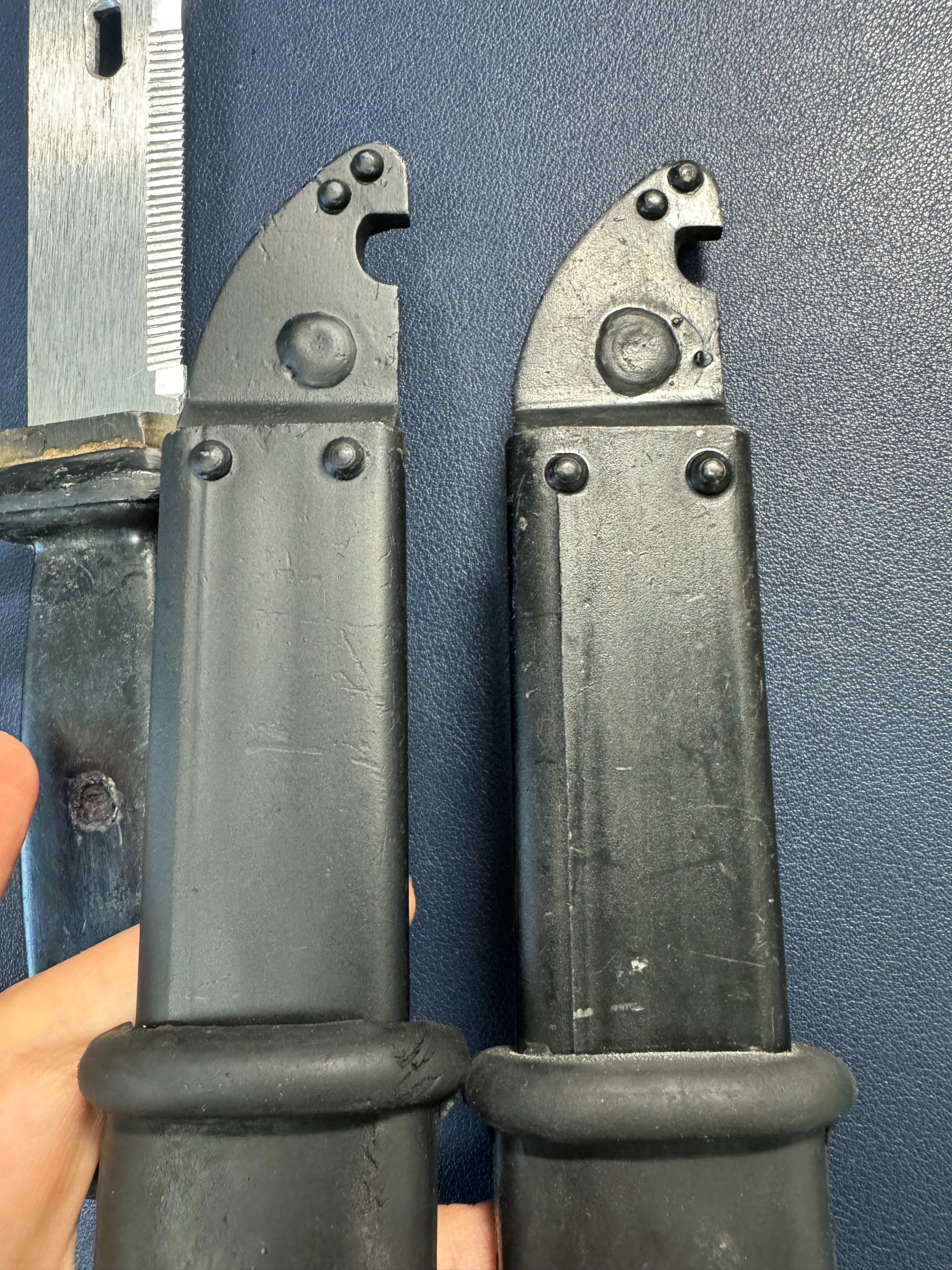 Maybe my eyes are deceiving me, but the rubber scabbard insulator on the left appears longer!? I would be interesting to see the other sides of the bayonets and scabbards. Maybe showing where the insulator stops on the front of the scabbards are located? Mike