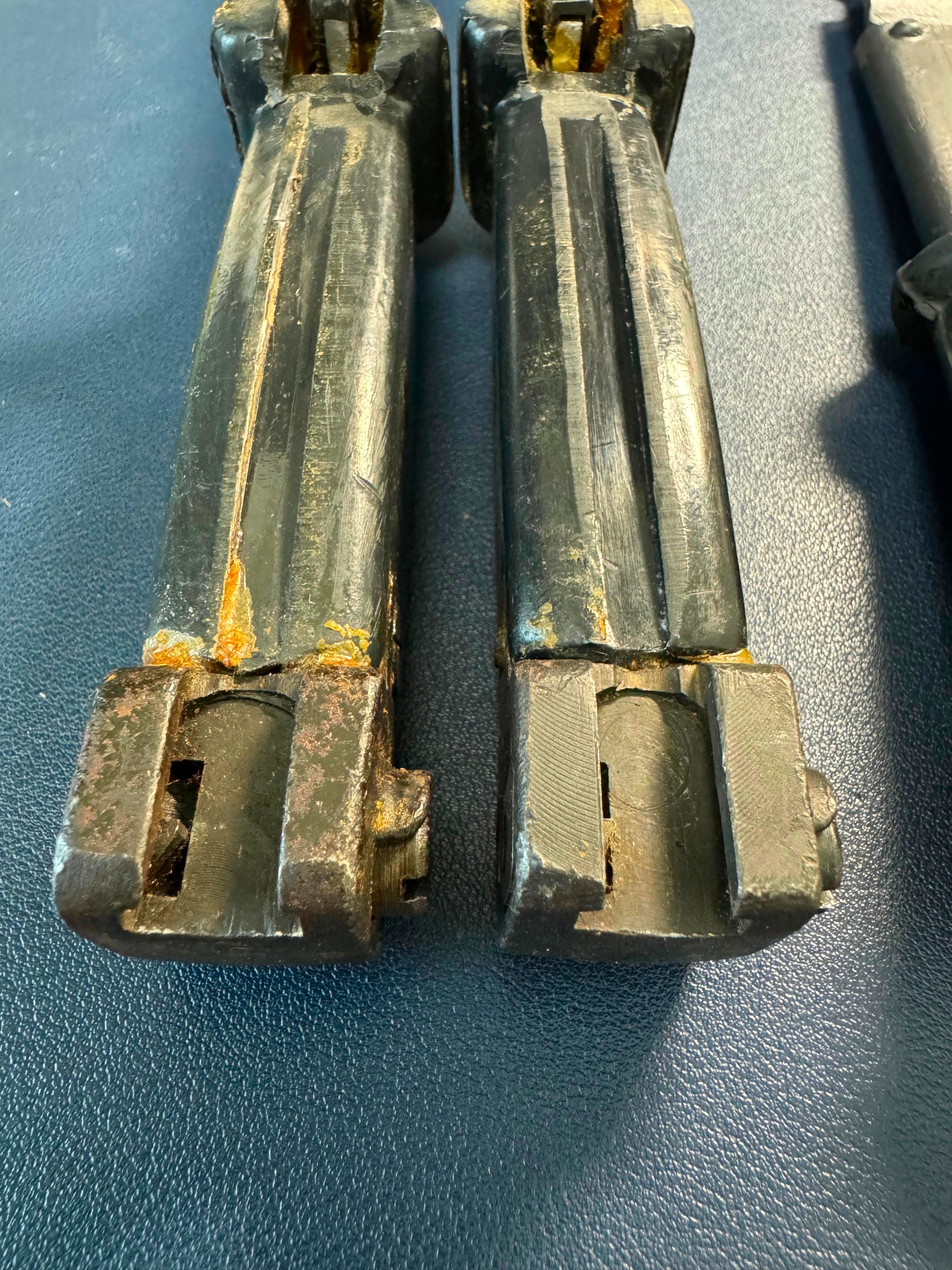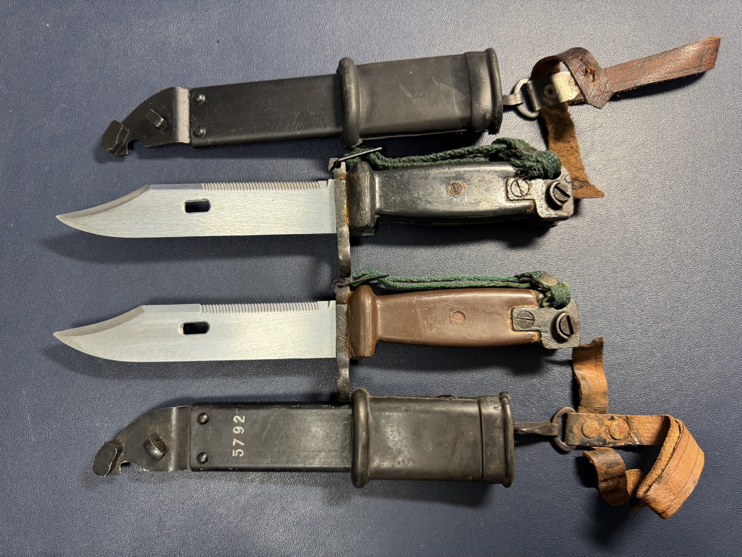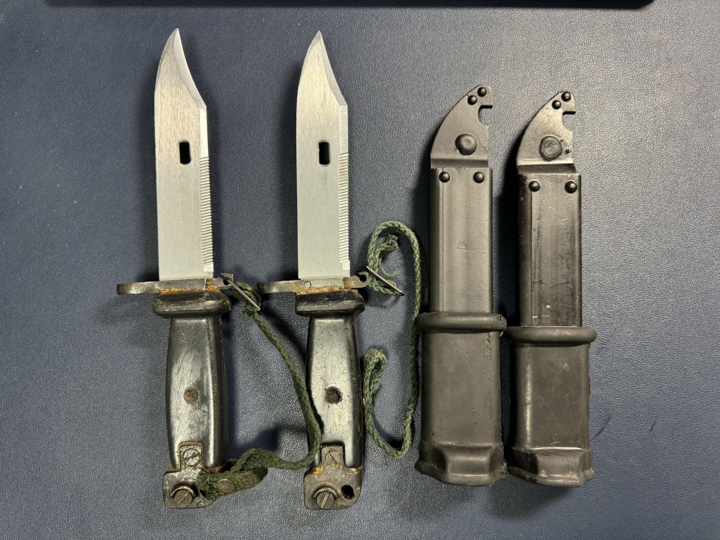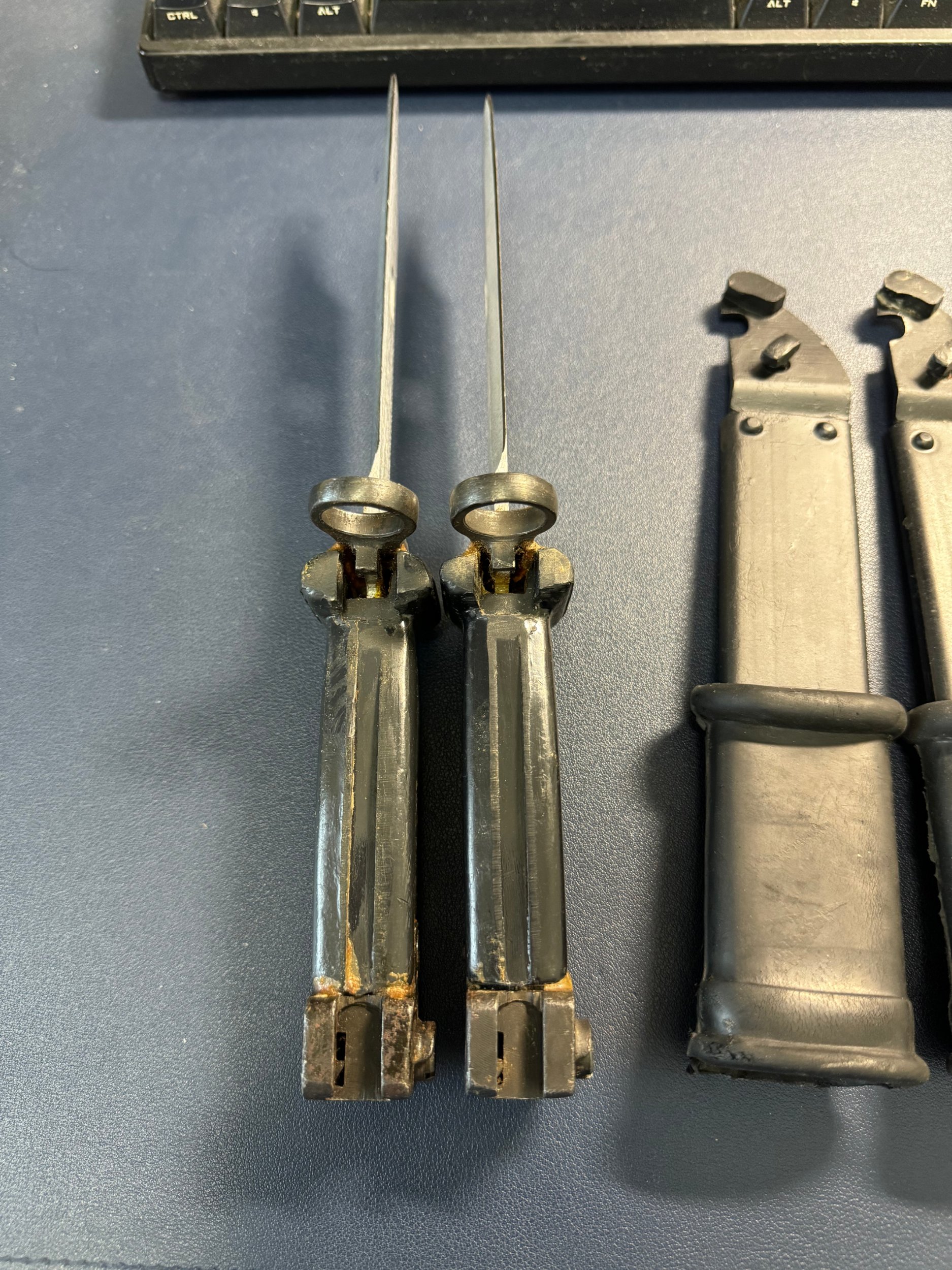 Maybe my eyes are deceiving me, but the rubber scabbard insulator on the left appears longer!? I would be interesting to see the other sides of the bayonets and scabbards. Maybe showing where the insulator stops on the front of the scabbards are located? Mike
