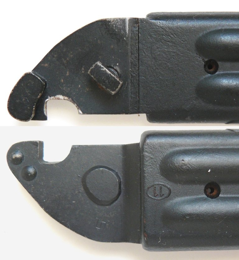 On the 6H4 with the black scabbard, the riveting of the crossguard is cleanly ground flat, the base of the attachment is left angular, very poorly marked with the acceptance mark, and the retaining ring is left with a sharp cast edge.