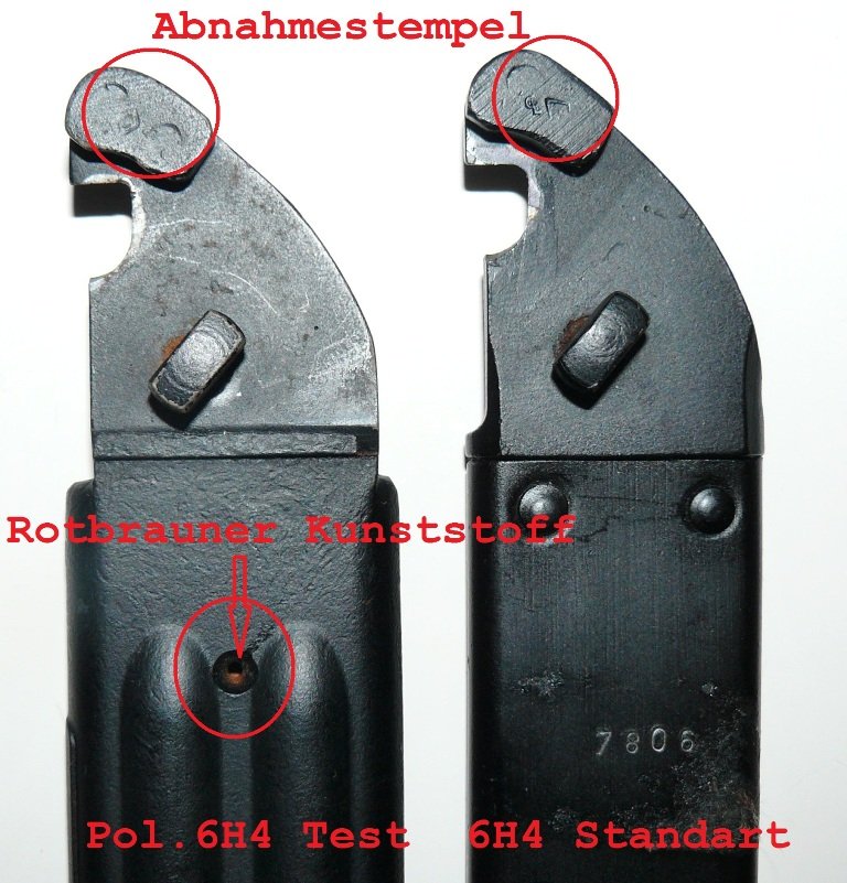 Beim 6H4 mit schwarzer Scheide ist die Vernietung des Parrierstück sauber Plan geschliffen,der Sockel von der Aufpflanzung Kantig belassen , sehr schlecht mit der Abnahme gepunzt und den Haltering mit scharfer Gusskante belassen.