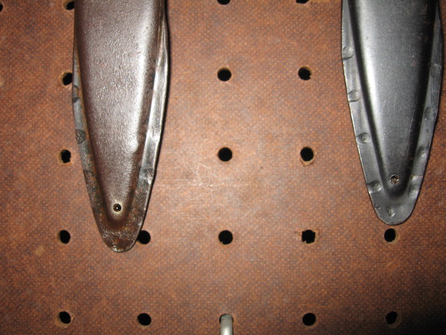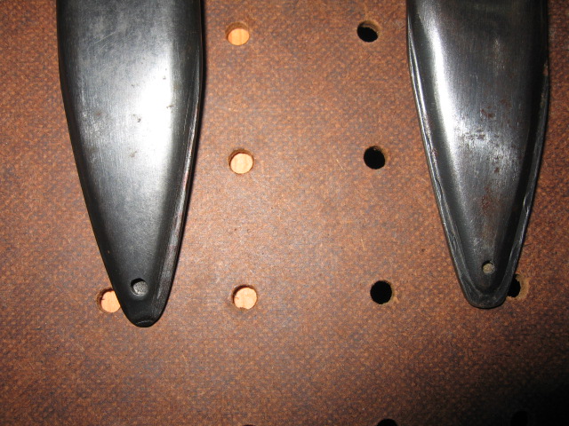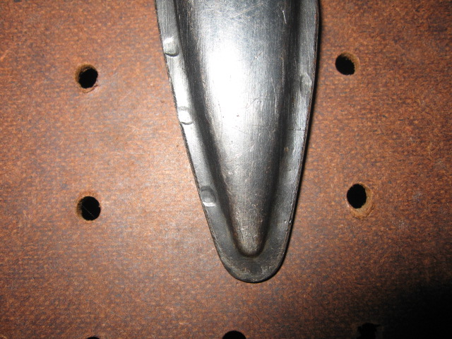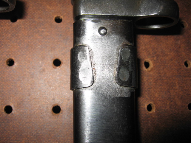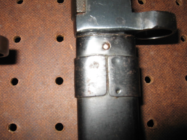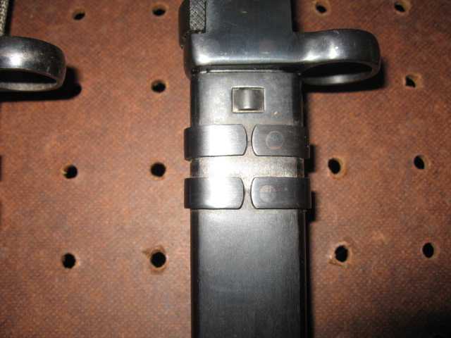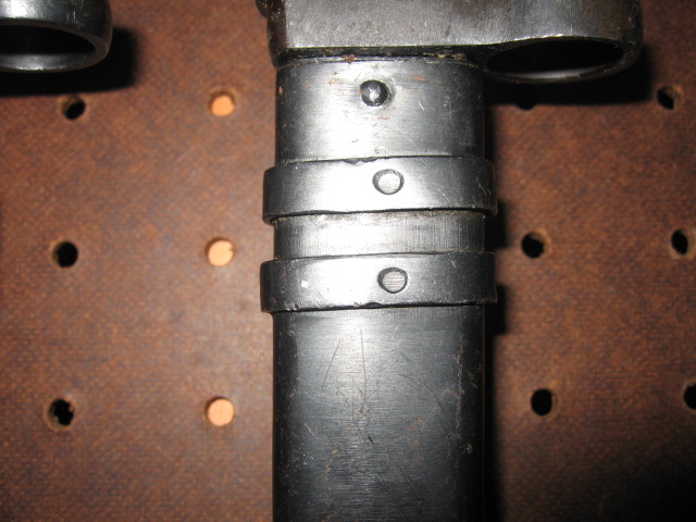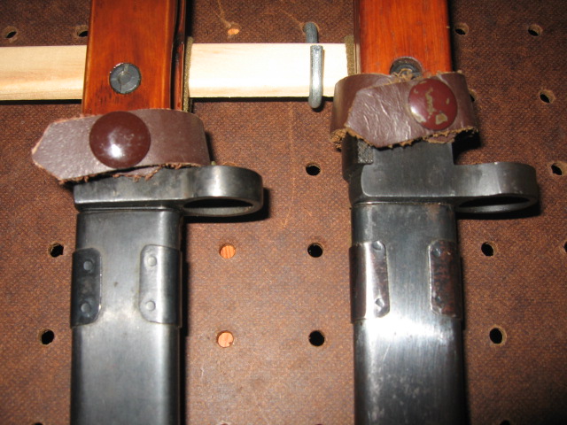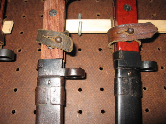 Scabbard hanger bars / brackets (front view) are usually different shapes and are secured to the scabbard by spot or contact welds. Below are single split hangers: 1st is Russian, Finland, Bulgarian, Romanian style. 2nd is smaller Chinese style. 3rd is larger, close together N. Korean style. Mike