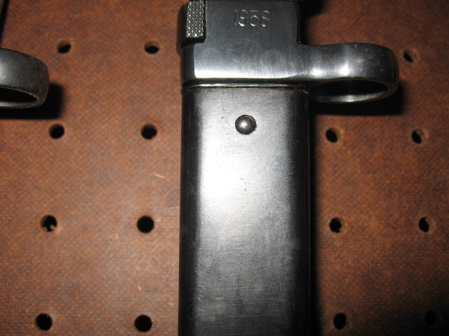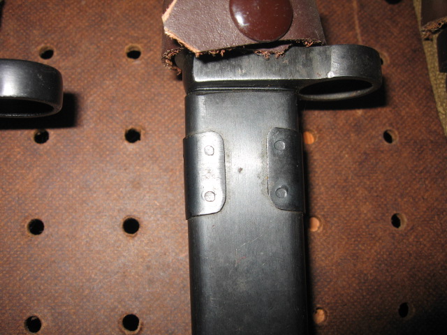 There are many different finishes on the AK47 bayonets and scabbards. Also many different styles and materials used in the permanently(?) attached hangers. These points are complicated by the amount of interchange, mixing and reworking. One other key method of scabbard is manufacturing the scabbard. The N. Korean scabbard is made from a flat piece of metal rolled and spot welded to form a tube and has a seam down the side. The Polish scabbards are formed by extrusion molding on a mandrel and have no flanges or spot welding. All others are formed by using a flattened seamless tube with pressed, spot welded flanges to form the tip. Mike