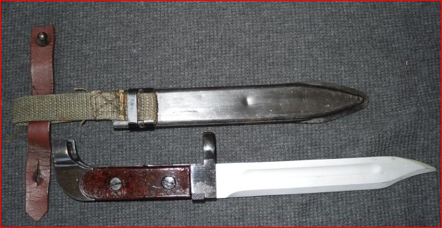 There are also a couple hybrid AK 47 bayonets that I omitted. One is a "transitional" N. Korean bayonet with an AK 47 hilt and attaching method. However it has the blade and scabbard from the newer AKM style bayonet. I do not have one of these so picture is borrowed. The other one is a newly designed and made in Bulgaria bayonet to fit on early AK47 rifles. They have a modified version of the AK47 hilt and the blade and scabbard of a AKM 6X4 type II bayonet. I do have one of these, but for convenience a borrowed picture Mike