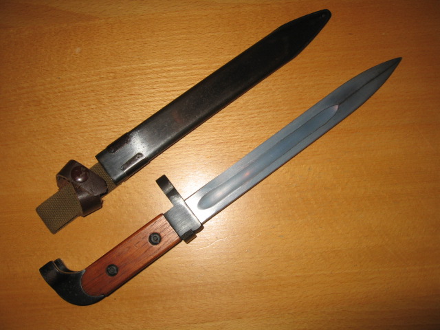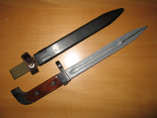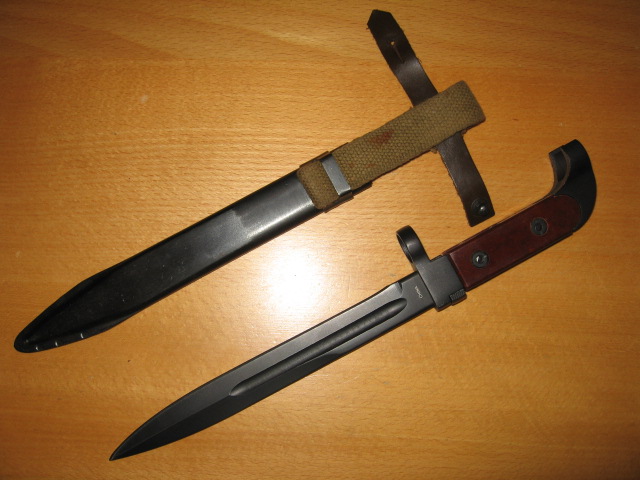 Here is another more recent Chinese AK47 bayonet replica/reproduction. It is advertised as a replica of an early "Bulgarian" AK47 bayonet and comes with non-replica fabric scabbard. The dimensions and weight are very close to an original AK47 bayonet and it can be mounted on an AK47 rifle. It is well made and the hilt is fully functional in fit and finish. The grip panels that come with it are wood, (oriental Chu wood?). The blade is the same dimensions and overall profile as an original. However the true and false edge grinding and the fullers are different. The most glaring difference is that the blade is finished black and marked "CHINA". To make it complete, and show interchangeability, I replaced the grips with a set of new plastic old stock Russian ones and added an original New old stock scabbard. Not a true collectable, but a fun piece.
