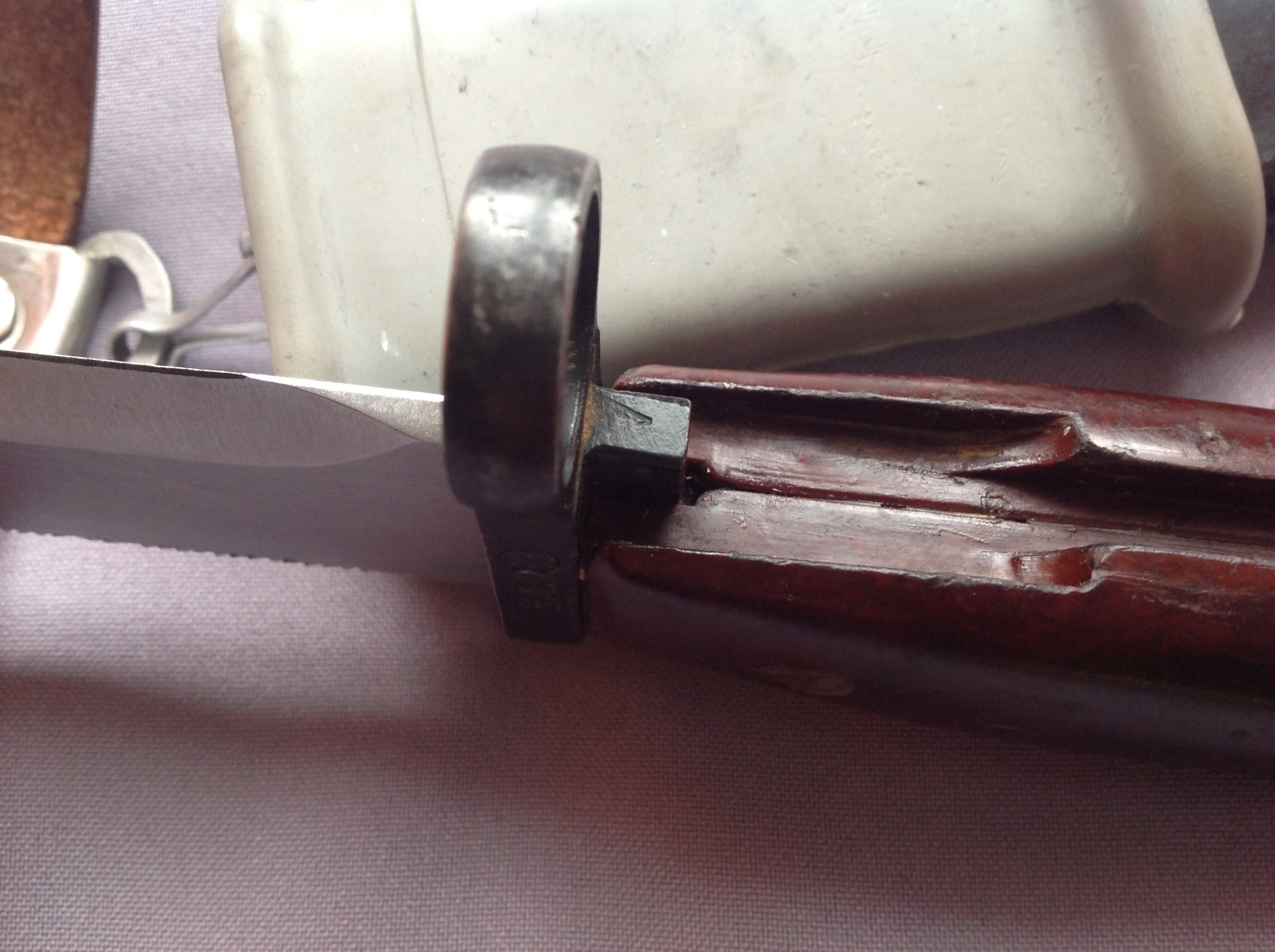 The serials and insulator are correct, but I am not familiar enough with the markings and other features to tell for sure. The arrow in triangle marking on this one are indistinct, and wanted to check that it wasn't a Russian one that had been serialed in Romania. It lacks the unpainted grey welding spot too, but has some interesting markings. I just read that these do have black painted scabbards, so perhaps that is correct. Be a while before I receive it, so wanted to maybe get some thoughts. Hanger isn't the usual 2 piece one..replaced?