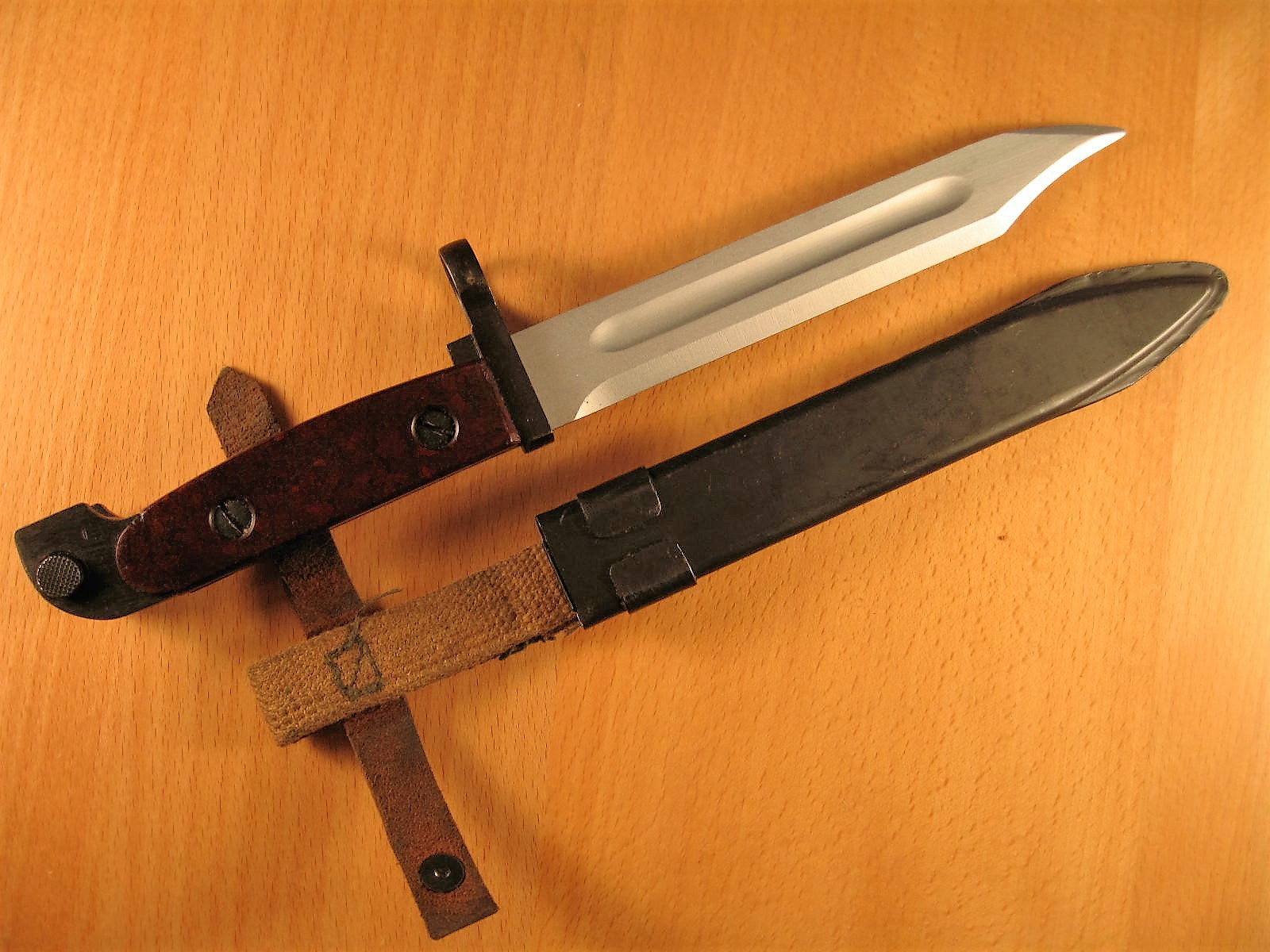 This a second version of the North Korean AKM bayonet. It is virtually the same as the first version with the exception that the Fabric hanger is tan colored. The tan versions have been found in Granada, Panama and Cuba among other places. There is some discussion as to whether they were made in N. Korea for export or just a production variation. Others believe that the were made or assembled in Cuba and or other countries on N. Korean equipment. M.