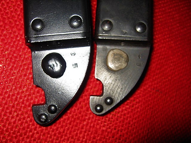 Here are close-ups of the painted vs blued scabbards and the flat vs domed rivets. Also note on the above pictures that some of the hanger belt loops are sewn others have a rivet. Mike