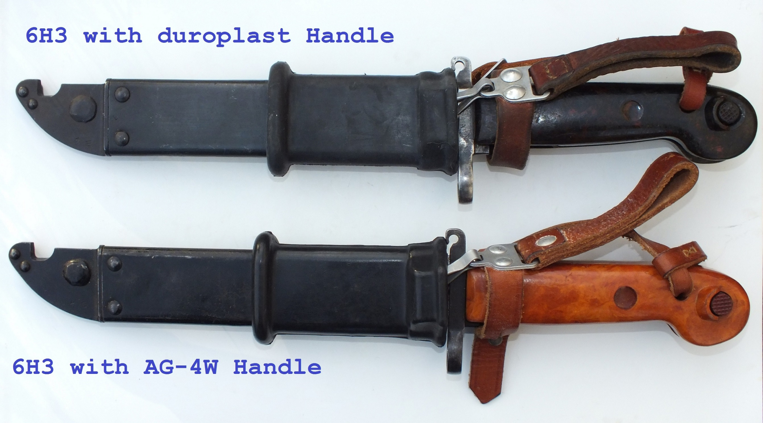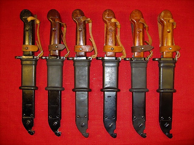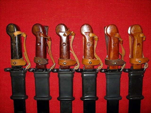 Attached are pictures of my six 6H3's showing color variations. All are in excellent to new, unissued condition. Two have matching numbers, two are un-numbered, un-issued, one has an un-numbered scabbard. One has miss-matched numbers to display an early(?) blued scabbard, the rest are painted black. Notice it is similar to the Romanian scabbards as the blue does not 'take' on the pivot weld. Also note the different rivets on the scabbard from flat to rounded. Mike