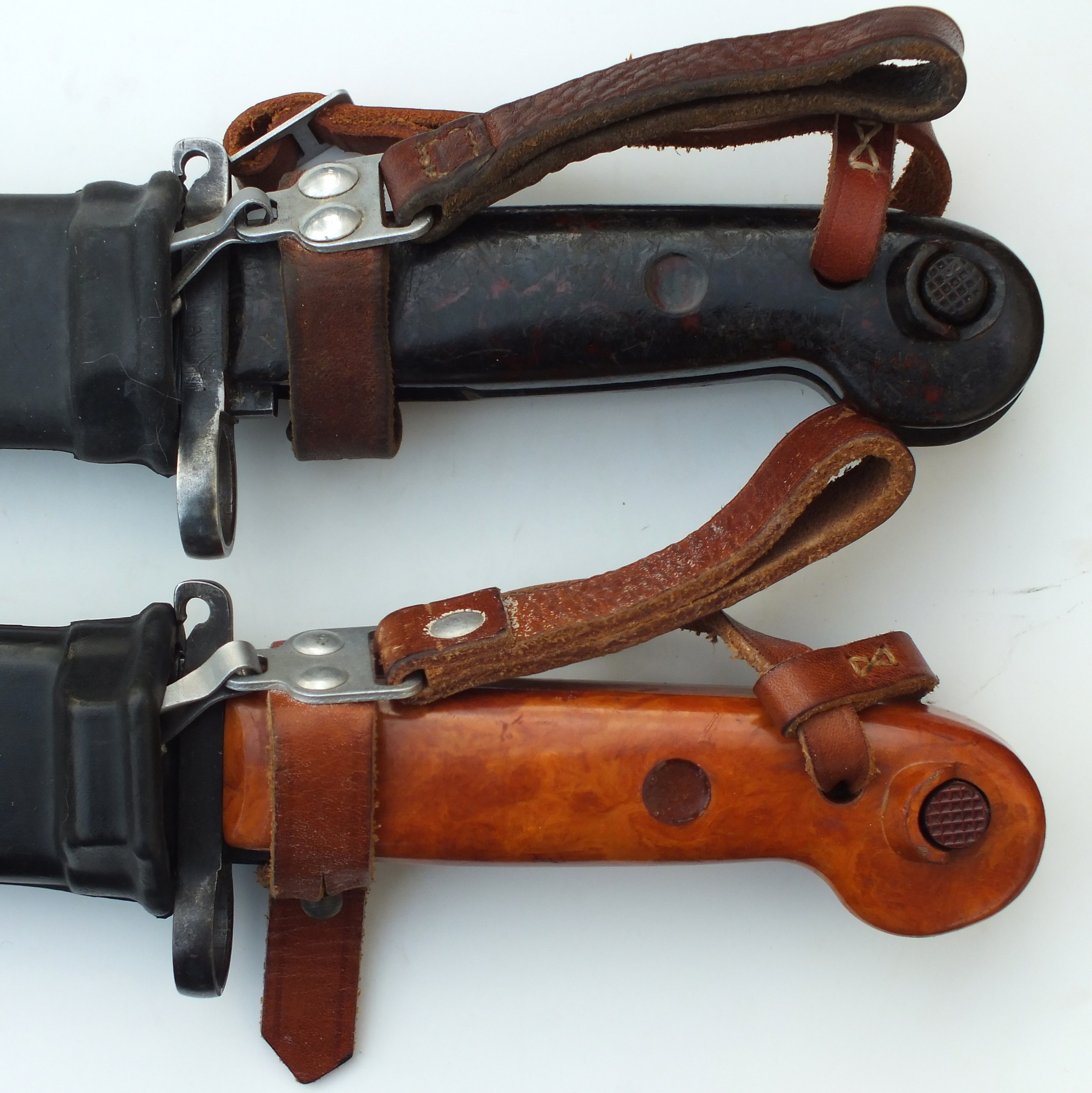 For all it's worth and for comparison, here are my four Polish 6H3 Type I variations that I display. Four different grip color variations, Black with red flecks and brown to orange shades. Note that one has an early blued finish scabbard and the others are painted black. Also one has a stitched rather than riveted hanger and the different sized rivets.