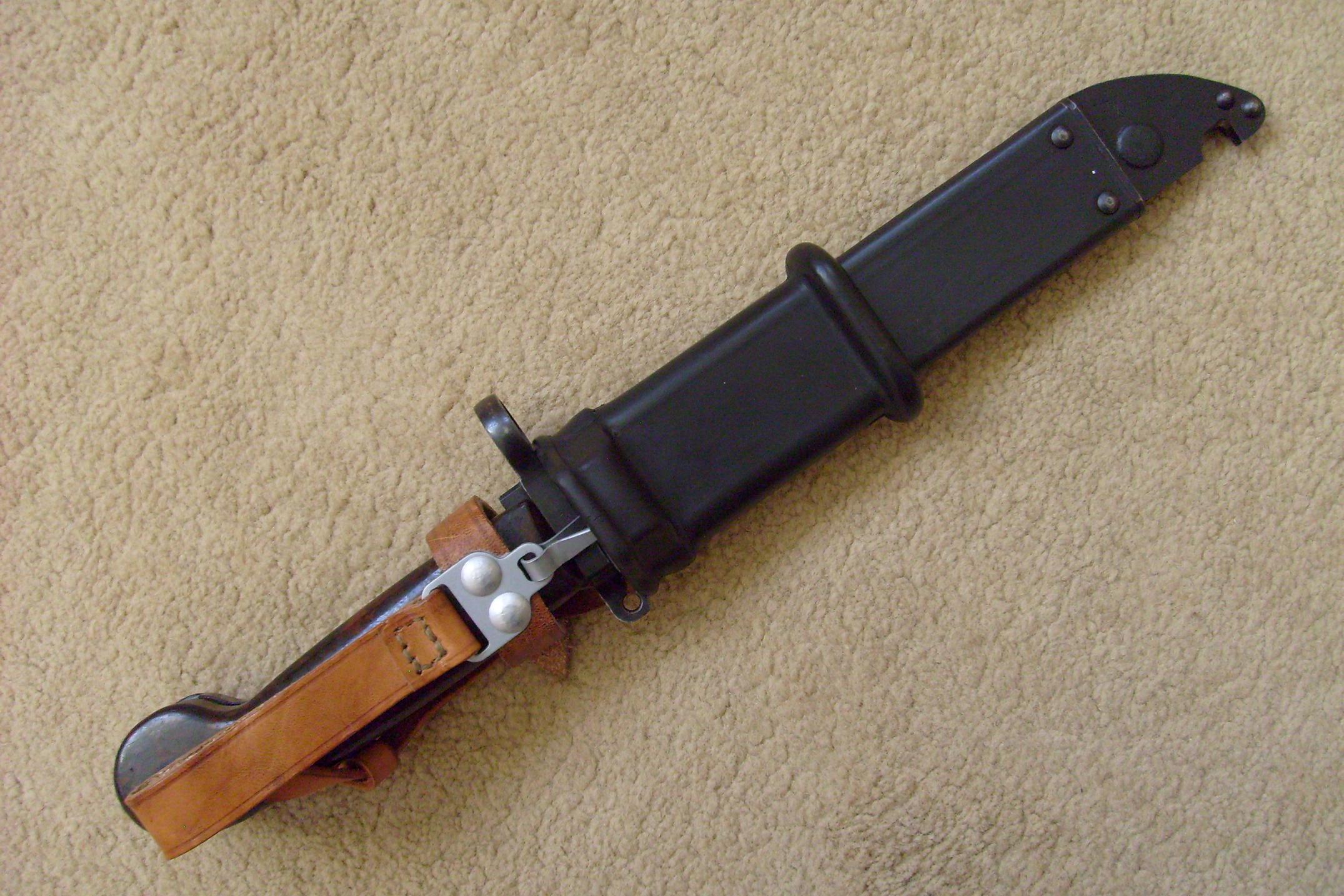 Hey Brian, I was just looking back at other posts and notice something on the 1st one. You mentioned it's from your files and perhaps not your picture or bayonets. Did you notice that two of the scabbards have the later style long insulators that were on some of the Polish AKM 6X4 bayonets from the "Archer" series? These are somewhat uncommon. Also the solid orange grips are interesting, I've never seen one of these close up. Are these the orange replacement/rework grips you mention? Do the bayonet & scabbard show other signs of being reworked? MikeBrian wrote:Pic from my files, showing the different handles on the Polish 6H3.