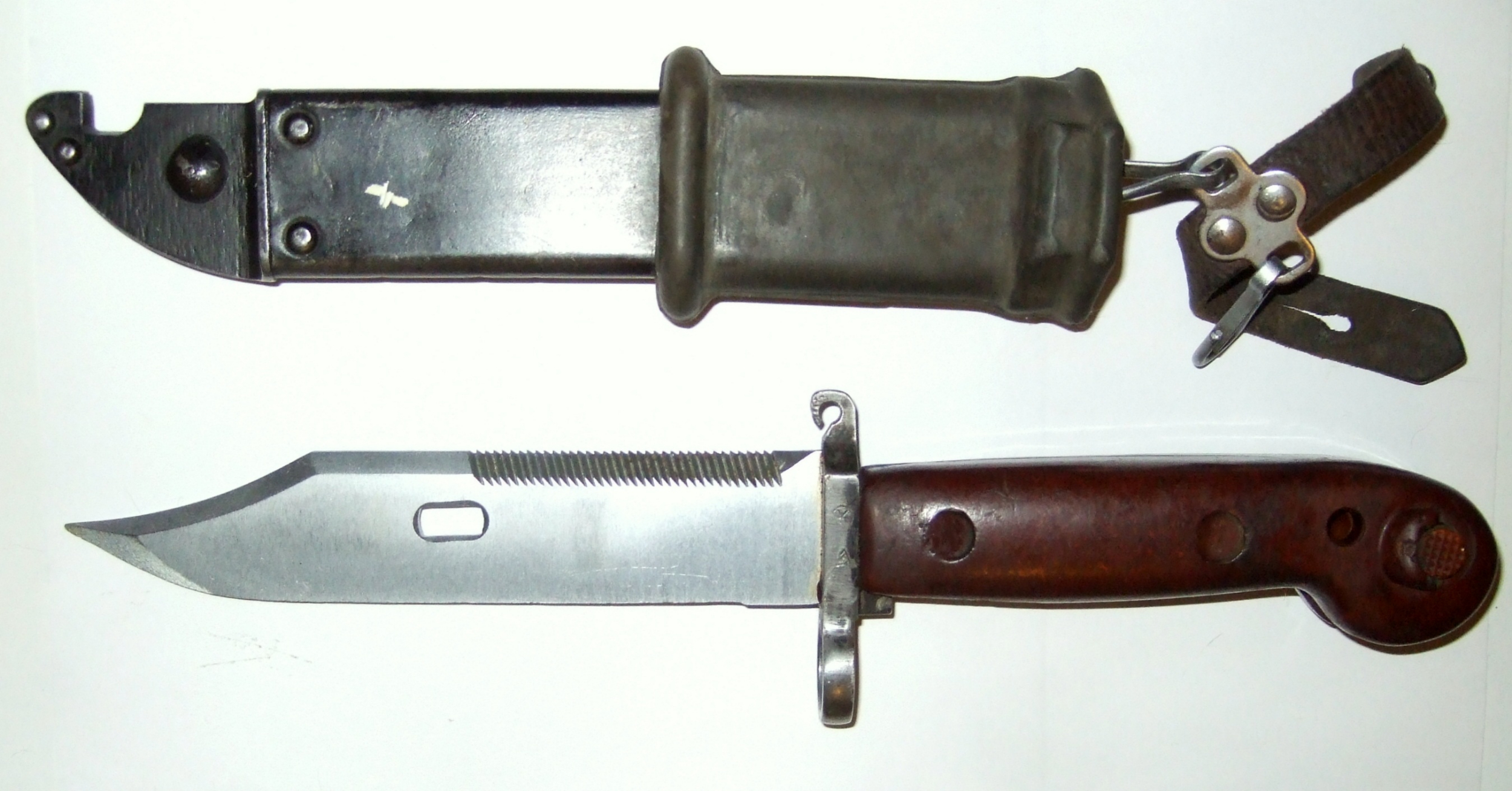I agree that the Romanian AKM 6X3 Type I bayonet and scabbard with the "flat" pommel was early production. This and the fact that production was limited makes them difficult to find, especially in decent condition. Yes, I have seen a few that have been reworked, but not out of proportion with the rework of the more standard ones. More about these bayonets under the "Romanian" heading.