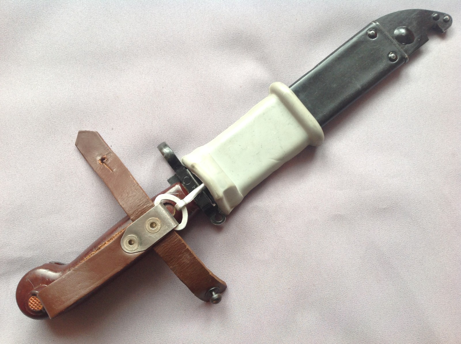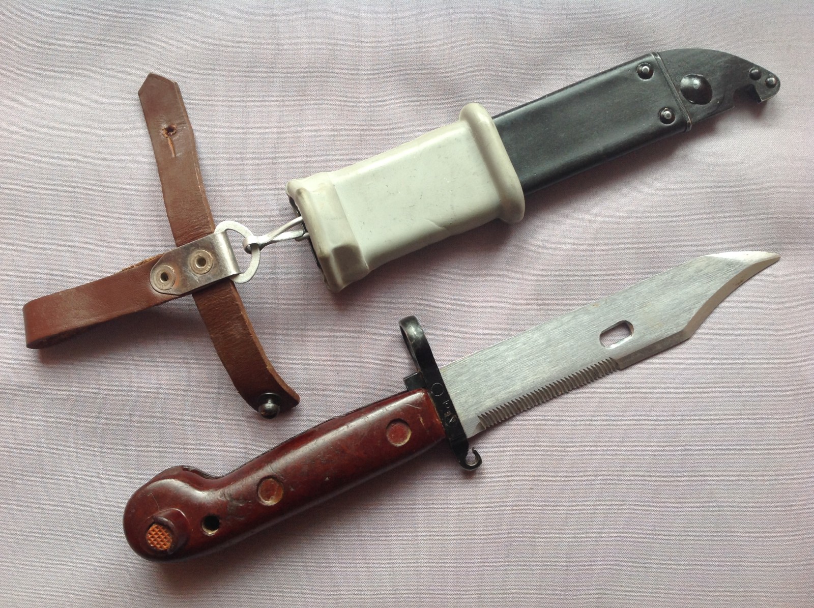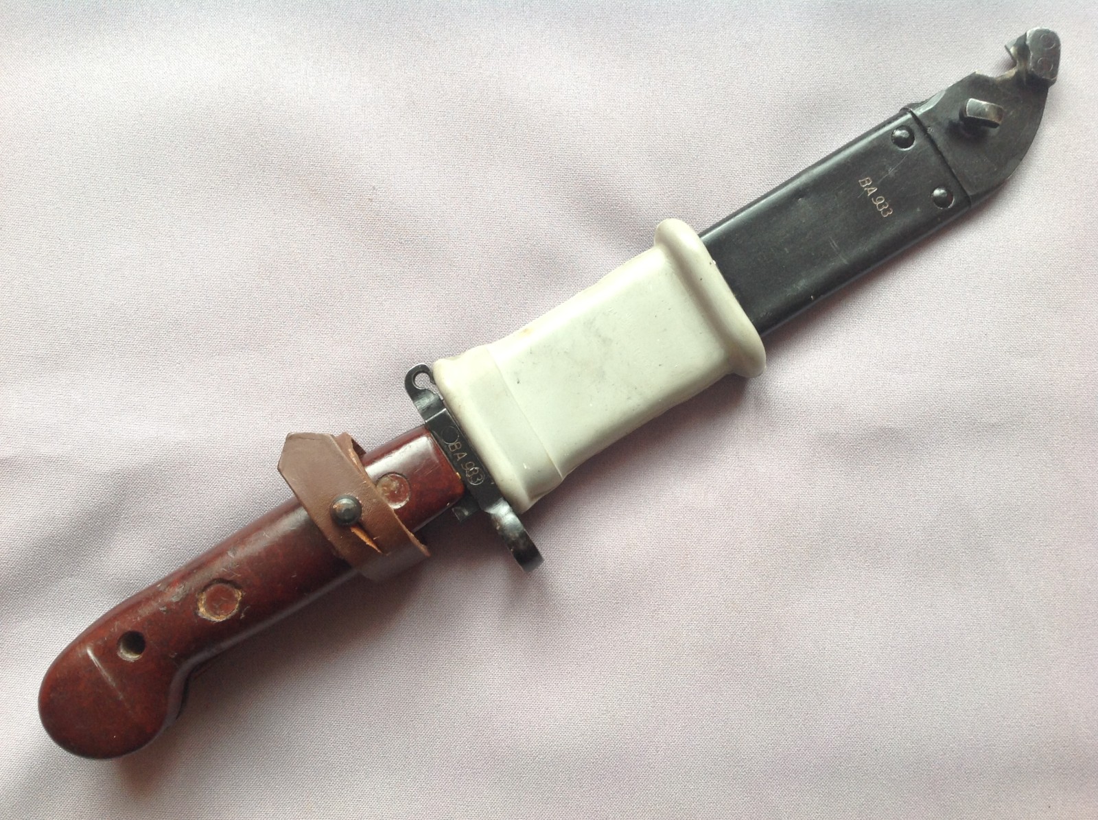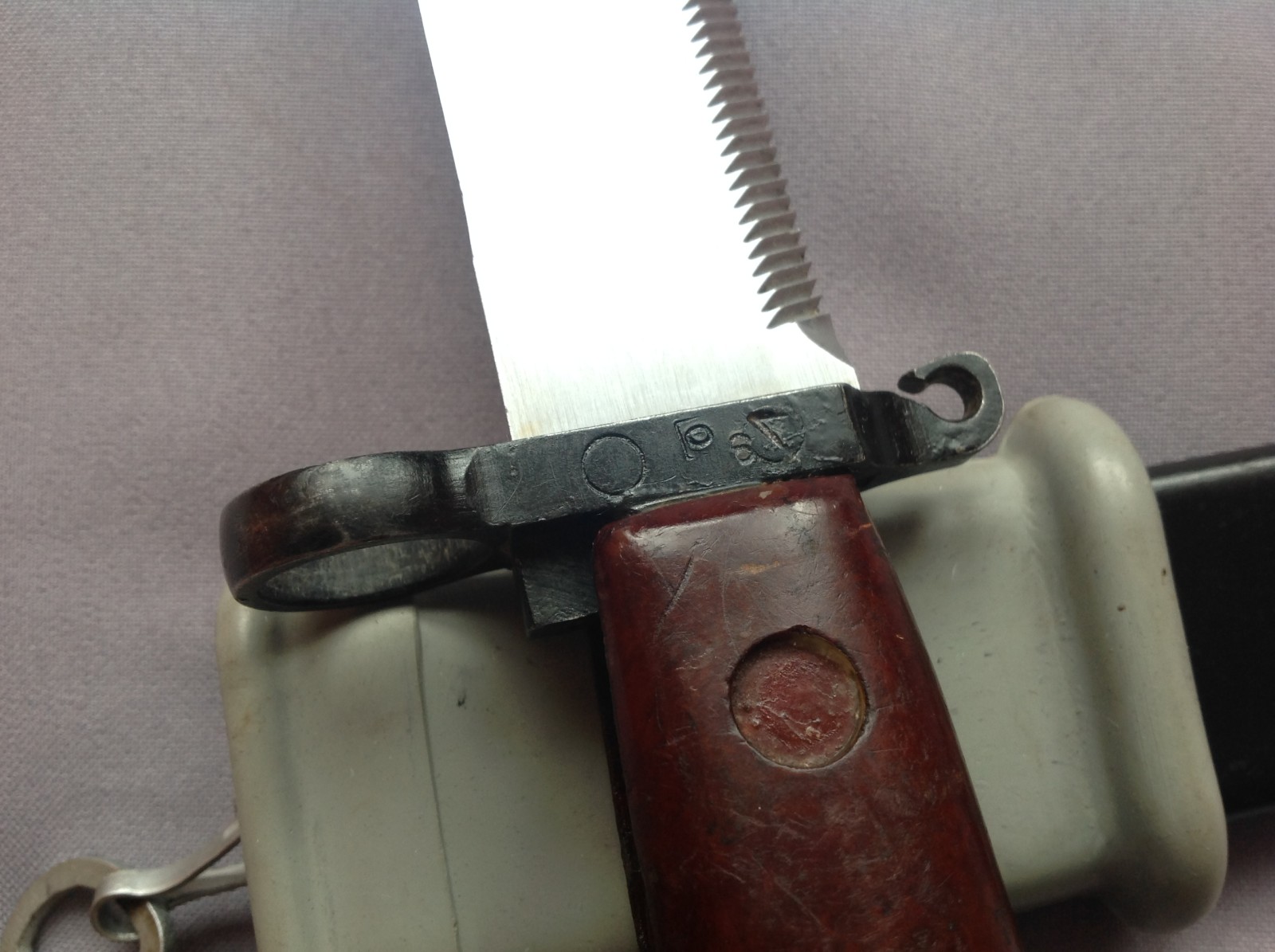 The serials and insulator are correct, but I am not familiar enough with the markings and other features to tell for sure. The arrow in triangle marking on this one are indistinct, and wanted to check that it wasn't a Russian one that had been serialed in Romania. It lacks the unpainted grey welding spot too, but has some interesting markings. I just read that these do have black painted scabbards, so perhaps that is correct. Be a while before I receive it, so wanted to maybe get some thoughts. Hanger isn't the usual 2 piece one..replaced?