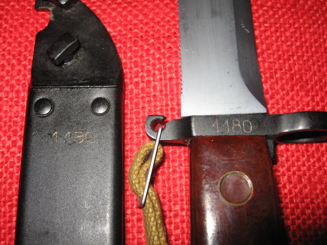 The one with the orange grips is a non reworked bayonet but the scabbard was remplaced. (The police of number are not the same on the crossguard and the scabbard).