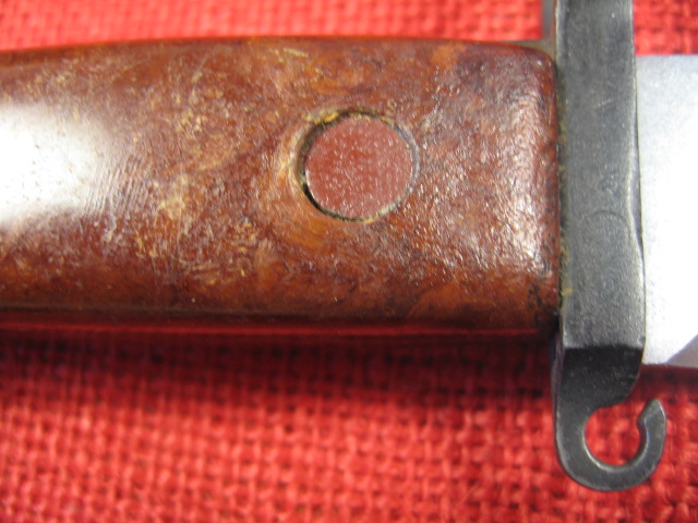 I used to think the same thing, very early Type 1's. My 1st one I had, the brown one above, I received from a friend from Russia 25+ years ago. Same guy I got the two new unissued Type 1's at the start of this post. It was early due to the round strap hook and the arsenal marks on the side of the crossguard. The scabbard was also a very early style, Both the scabbard and bayonet were obviously reworked with force matched numbers. Since then I have had the opportunity to help sort through and catalog a large number surplus Russian bayonets from Russian and Bulgarian sources. Most are reworks from long term storage. Some were imported by various arms dealers and some others that deal only in general surplus items. I wish I had had the funds and foresight to purchase more than the few I did for my collection as well as a few others for friends and traders. All of the few flat end pommel bayonet I have seen have been reworked and appeared to me to have had the grip panels replaced. The bayonets were obviously well used and reworked and the grips were in much better condition. I added the 2nd squared pommel, the orange one above, much later because it was in such good condition and much later production. The strap hook is angular and the arsenal mark is on top of the crossguard behind the muzzle ring. Again both the bayonet and later style scabbard were reworked with forced matching numbers.
