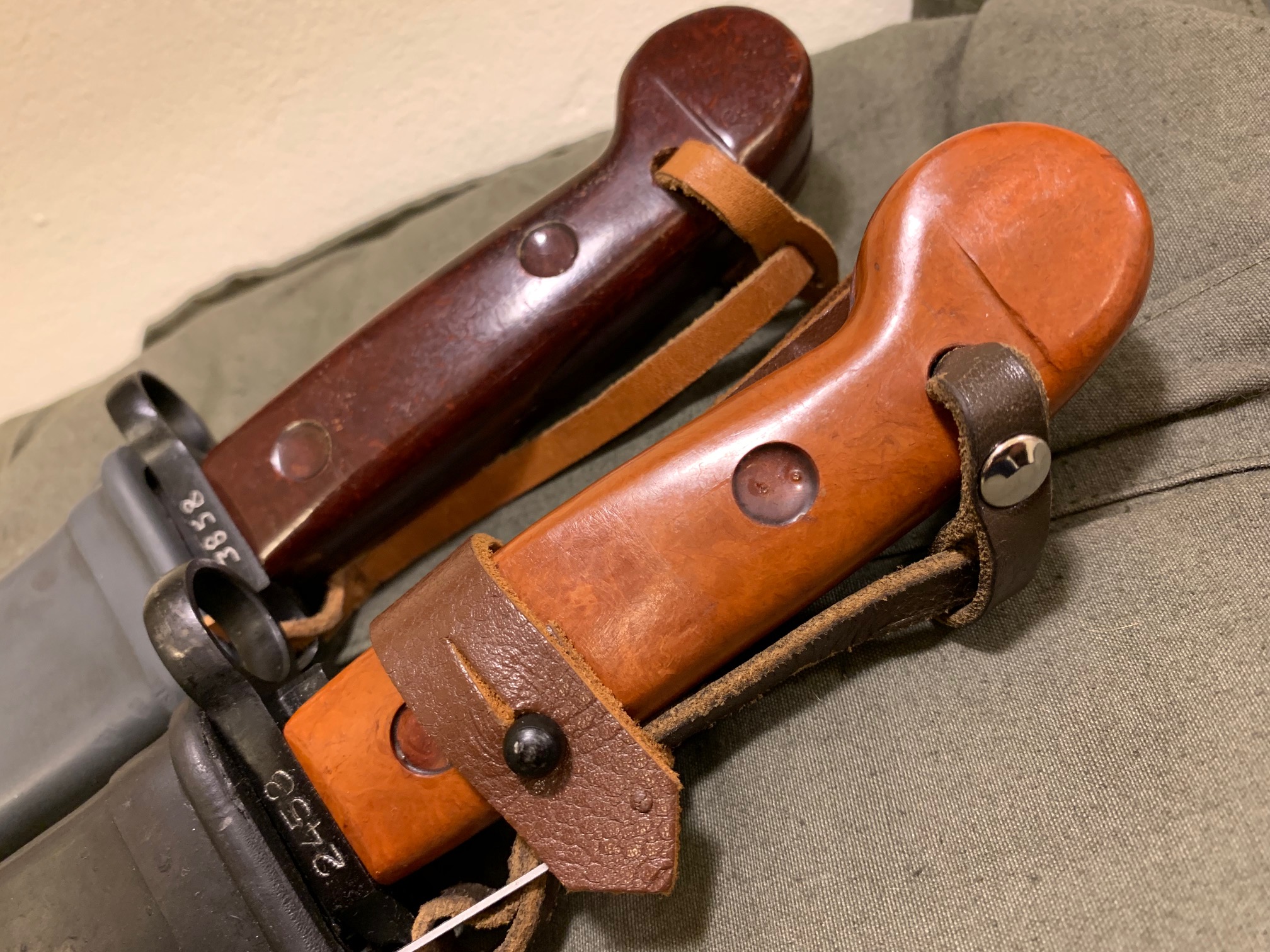 The one with the orange grips is a non reworked bayonet but the scabbard was remplaced. (The police of number are not the same on the crossguard and the scabbard).