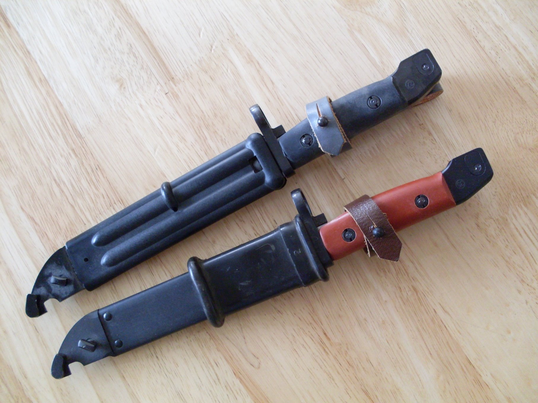 These AKM bayonets and scabbards have been around for a while. Both bayonets are identical except for grip panel color. Not much is known about them and there is a lot of conflicting information and theories. Most recently a member of this Forum mentioned a friend had seen them for sale in a Vietnamese tourist shop, so I went with that. There are others that say they were made, or assembled, in North Korea and several other countries. An other theory is that they were made up from surplus parts for the collectors and not for military use. Some known facts; The scabbards and hangers are East German (DDR) both Type I and Type II wire cutter scabbards are found randomly mixed with both color bayonets. These scabbards have all the original proofs and markings but no serial numbers, (unissued surplus). Both long and short new grey leather DDR hangers are also found mixed with the scabbards and bayonets. One theory is that the blades and cross guards are also DDR, but on close examination I am not sure about that. More on that later with pictures. Also note the black rubber insulator on the DDR Type I scabbard is rather unusual as well. Another important note is that these are AKM wire cutter bayonets, but they are NOT insulated against electrical current. They are solid metal from pommel to point. M.