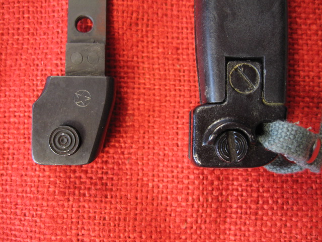 Both of mine (red grip/black grip) are "circle 21" marked. There seems to be some certainty that these were imported to Europe as "knives" sans scabbards, from Vietnam per Stottman. The question here is were they just referred to as "knives" by the exporting country because they lacked a scabbard (again, per Stottman) or were they true knives which were later modified into a bayonet configuration? It sounds to me they were imported in the present configuration. I was unaware they arrived on the scene so recently (2006). The amount of effort and expense to retrofit this "knife" into a bayonet would probably not justify the cost to do so. I agree the "circle 21 & 27" markings certainly resemble Bulgarian arsenal markings. It is possible these bayonets were made elsewhere and sent to Vietnam as a limited run for trials, etc. Still, I can't help wonder about the similarity of the general design (other than the blade) having a close resemblance to the N.Korean AKM bayonet. Not long ago I bought a Vietnam war era synthetic belt/buckle from a Ebay seller there. He sells a lot of militaria. I am going to post him with some photos of this bayonet and see if he has any knowledge about it and/or what the original scabbard may have been...