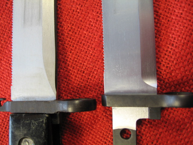 Here are some close up pictures of one of these bayonets disassembled. I don't usually do this and don't recommend it, but my analytical curiosity got the best of me. These bayonets are very well designed and manufactured and of very high quality fit and finish. A small detail I noticed on reassembly is that the heads of the grip machine screws and their nuts are of different thickness and not interchangeable front to rear. This is to make up for the front of the hilt is narrower than the rear. Very over engineered. It would have been much easier and more economical to just use a shorter screw!? M.