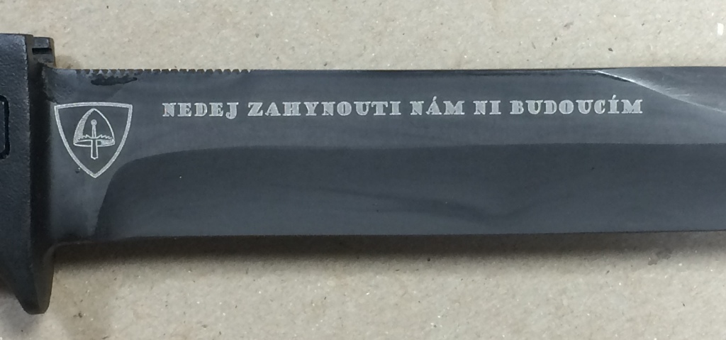 It was made limited edition of 100 pieces from 17029 steel just for members of 121st company with stamped Numbers 001-100 on the right middle side of blade and on the right is laser carved sign of company with their moto "nedej zahynouti nám ni budoucím". Rule was that nobody except members can get the knife so there was certificate paper with number of knife, owners name and signature of company commander (77 were granted). Color of certificate for ordinary soldiers was green while for honorably gifted was red. It was even made gift set of 5 pieces marked H001 - H005. For other units are produced without markings and material was 12020 carbon steel.