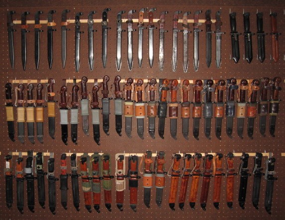 I have a few shadow boxes to display unique collections. Each one holds 3-4 bayonets. I bought them at Michaels and stained them and added dividers myself. The rest of my bayonets are in poly sleeves in ammo crates.