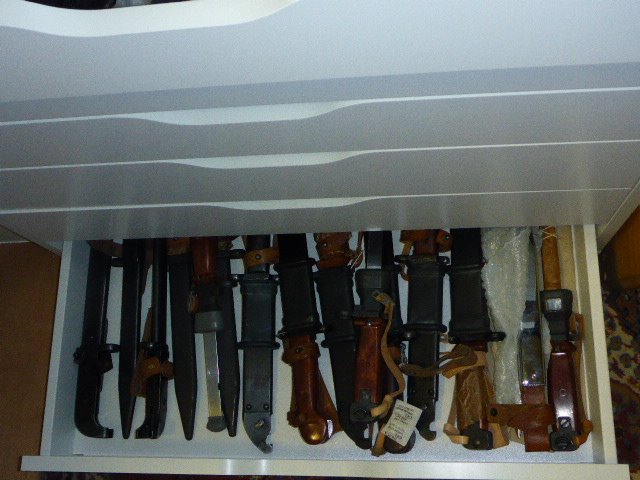 How do you display or store your items? This is how I display my main collection. These three pictures are of one wall displaying what I consider major variations of AK47, AKM and AK74 bayonets. They are easy to locate and remove for study if needed. There is a second wall with a further 100+ AK related bayonets including spikes, non-traditional and minor variations. Spares and accessories such as hangers, wrist straps, insulators, etc., are kept in drawers.