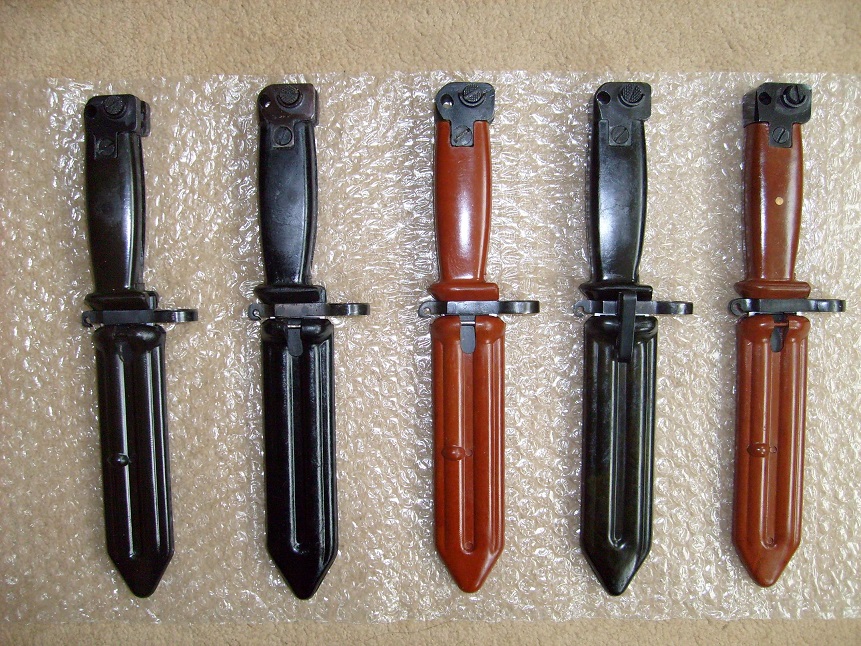 These "Green" bayonets and scabbards are somewhat rare and difficult to identify. Under normal lighting they appear to be the more common black ones. They require examination under bright lights or sunlight to really see the green tint. One of the things I look for are the small bump on the scabbard as all green ones seem to have this. That eliminates all the smooth scabbard black ones. The bump ones can be both black and green so you still have to look close under lights. Remember, mixed scabbards are also a possibility. I found my green one at gun show. The dealer had what looked like two different black ones. Close examination showed one was green and the other black, but someone had switched the scabbards. The dealer would not switch them back so I had to buy them both, but ended up with a nice one. M.