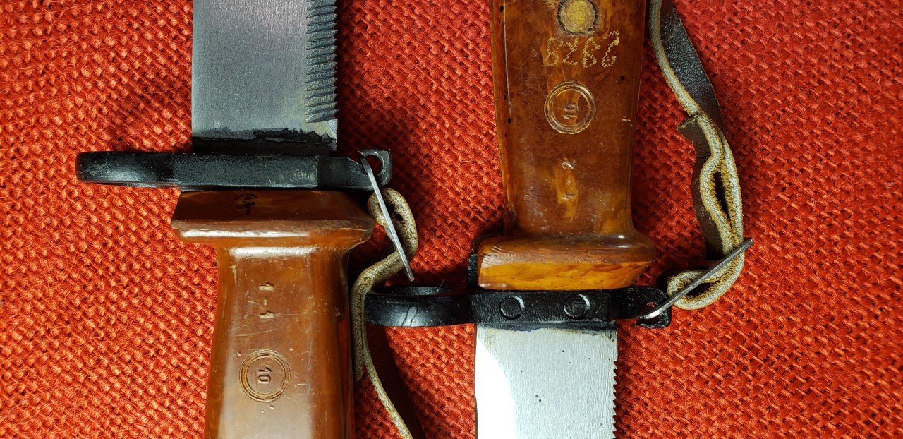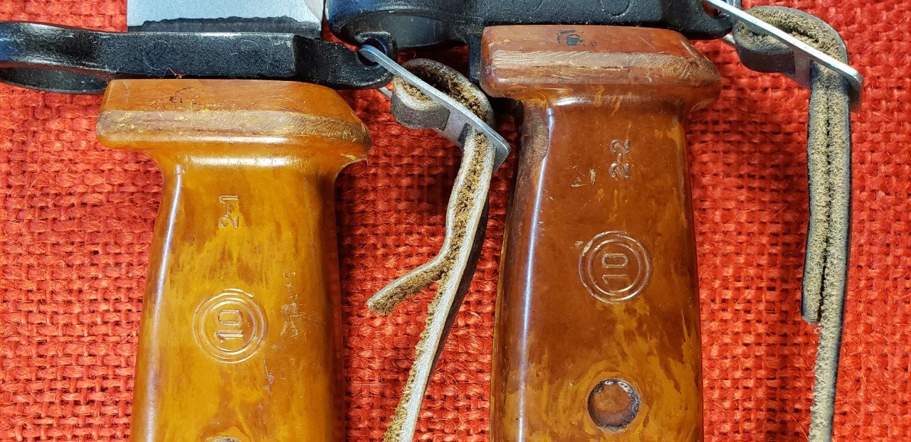 Here are some examples of the molded arsenal marks and mold numbers found on Bulgarian AKM 6X4 bayonet grips. The first two are large 10 on the right side with mold number 2-1 and 2-2. The second two are small 10. One is upside down on the right side with mold number 1-1. The second one is right side up on the left side with mold number 1-2. There may well be other combinations of the different arsenal marks, mold numbers and positions. Mike