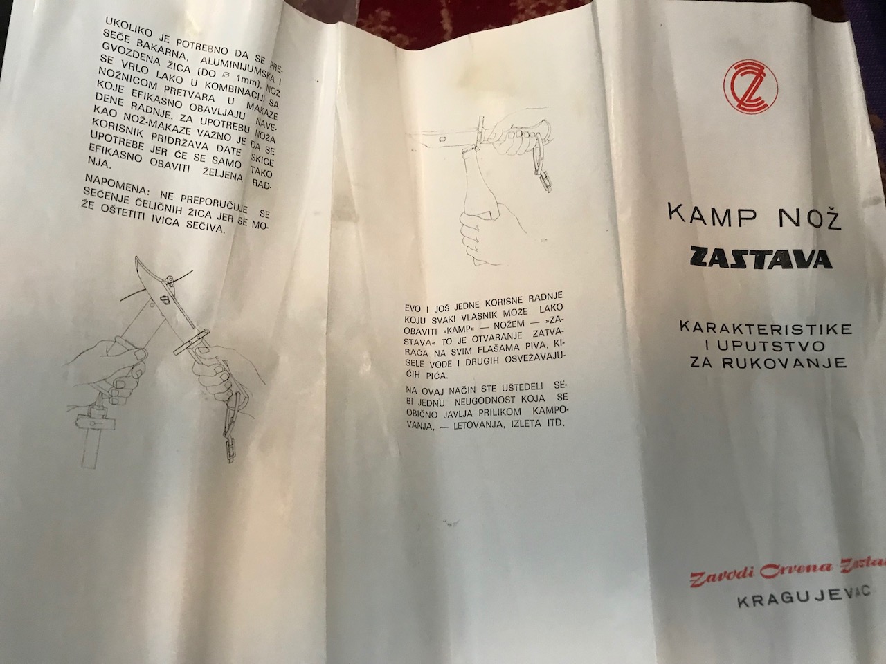 Another thing to consider is if this knife is even Yugoslavian at all? This is a translation of the front of the instructions. Camp Knife Flag. Features and Operating Instructions. Red Flag Institution, (Company?). Kragujevac, (SERBIA!). Mike