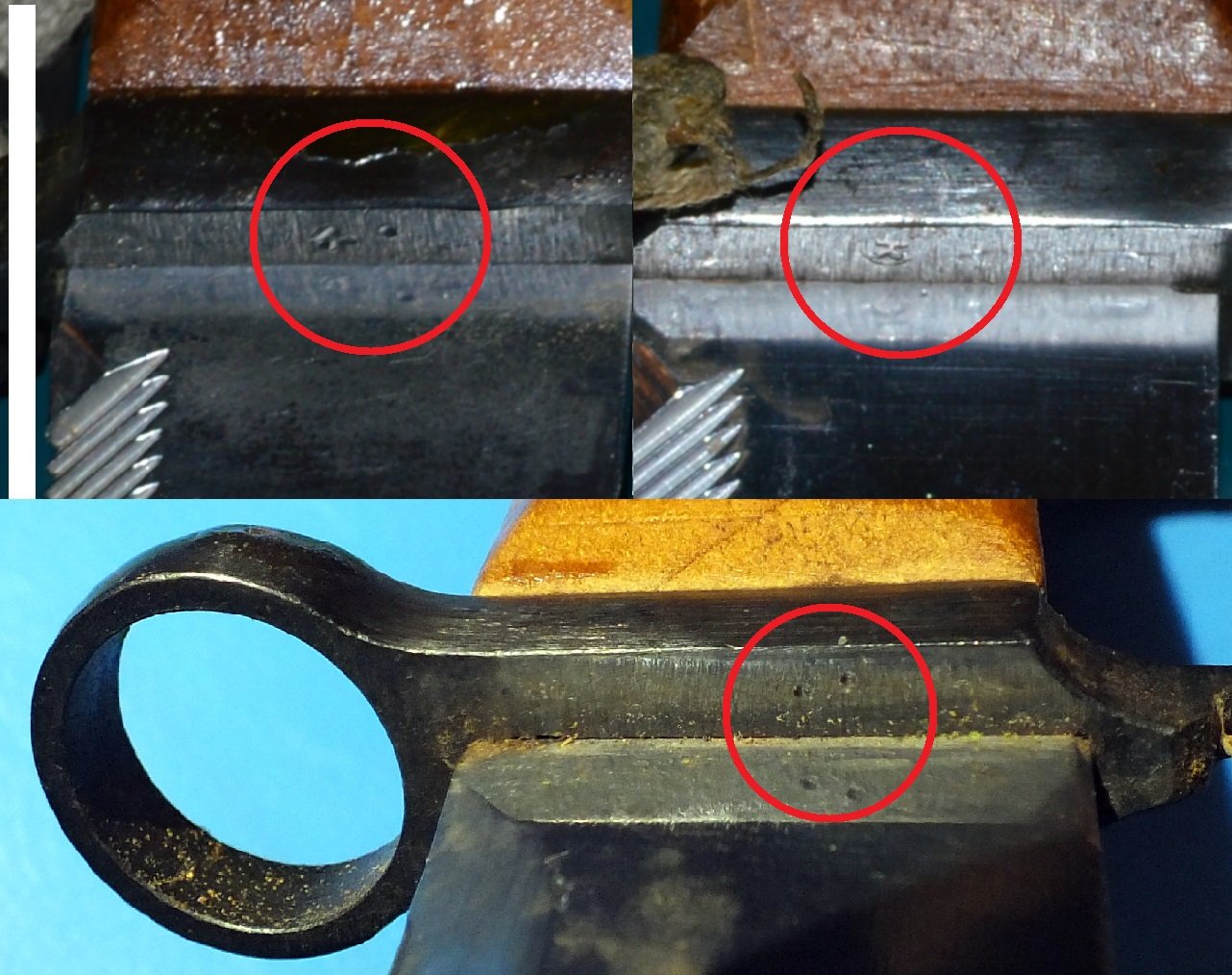 There are occasional production marks under the guard. A few sheaths have 1-3 differently arranged dots stamped on them.