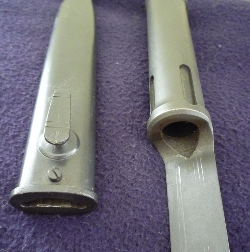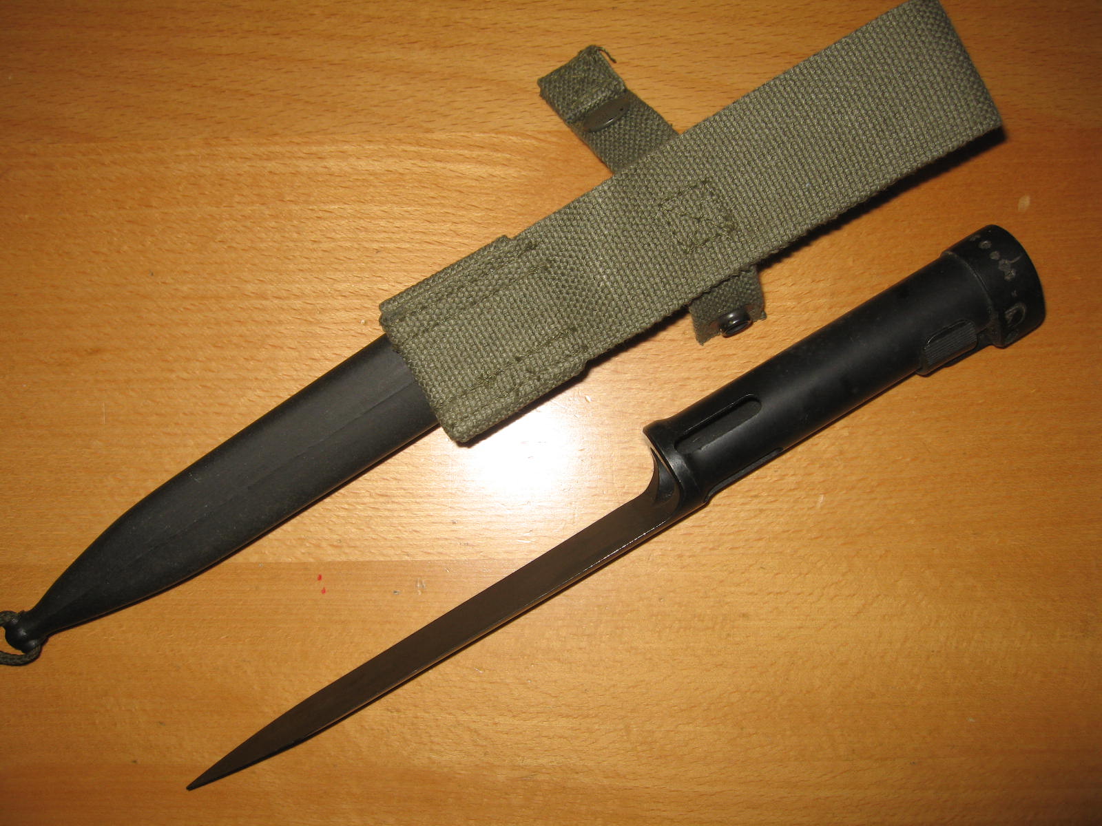 This is a South African R1 bayonet and scabbard. It is for their FN-FAL style weapons. This is the type of bayonet that was modified to fit on the South African Galil/Kalashnikov style R4 rifle. The R4 is featured in Martin Ivie's book "Kalashnikov Bayonets".
